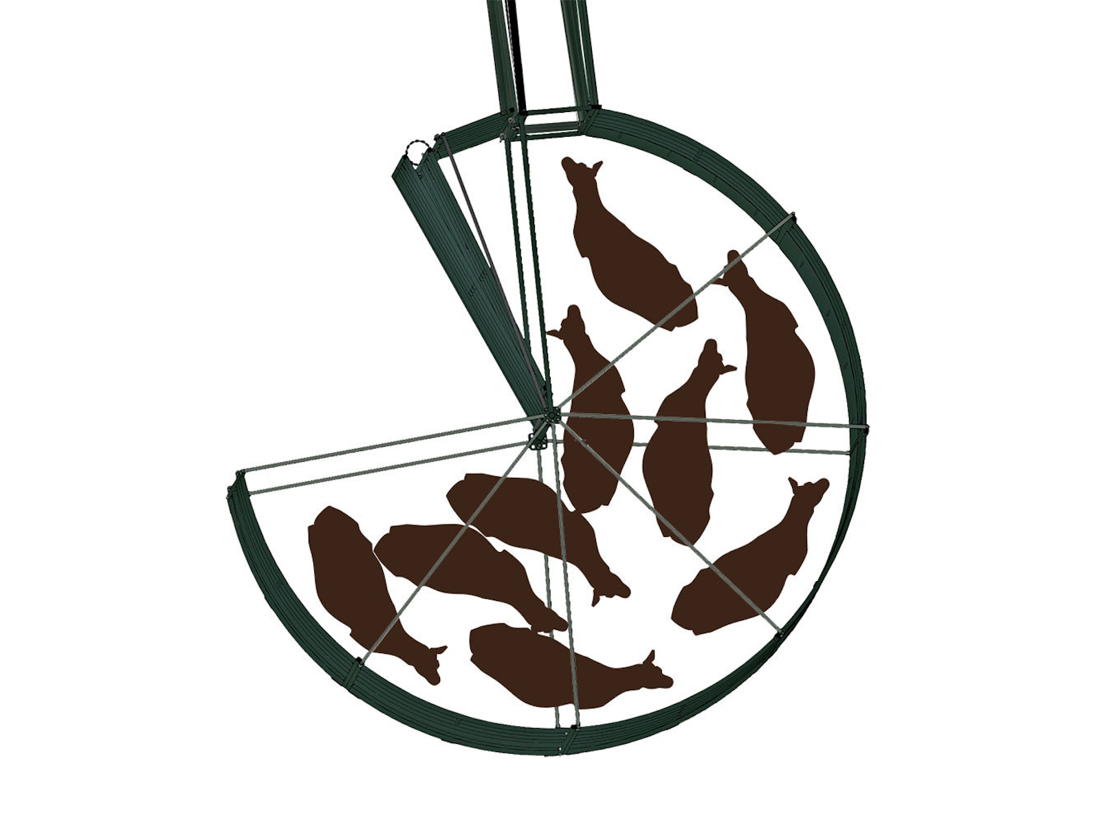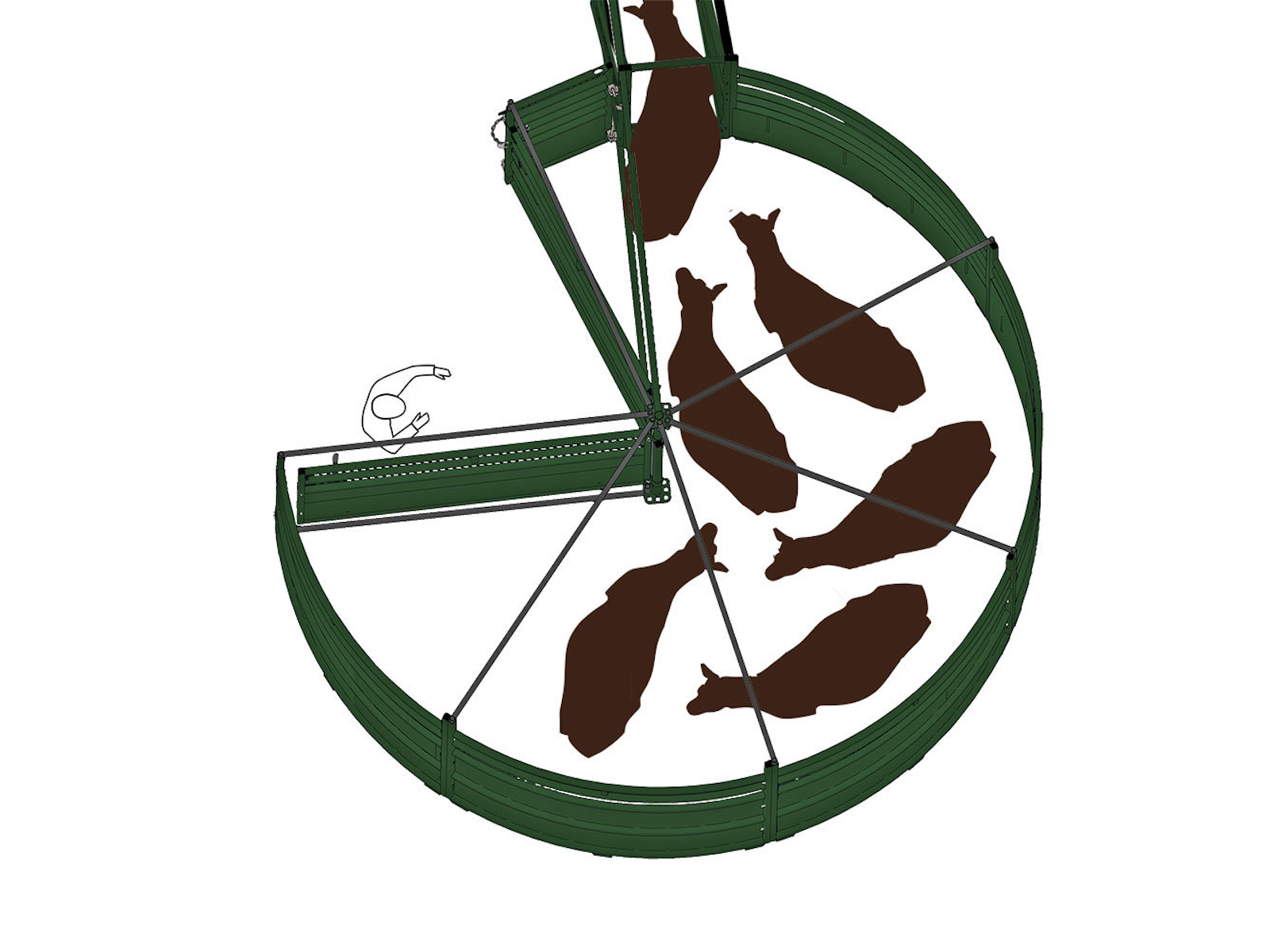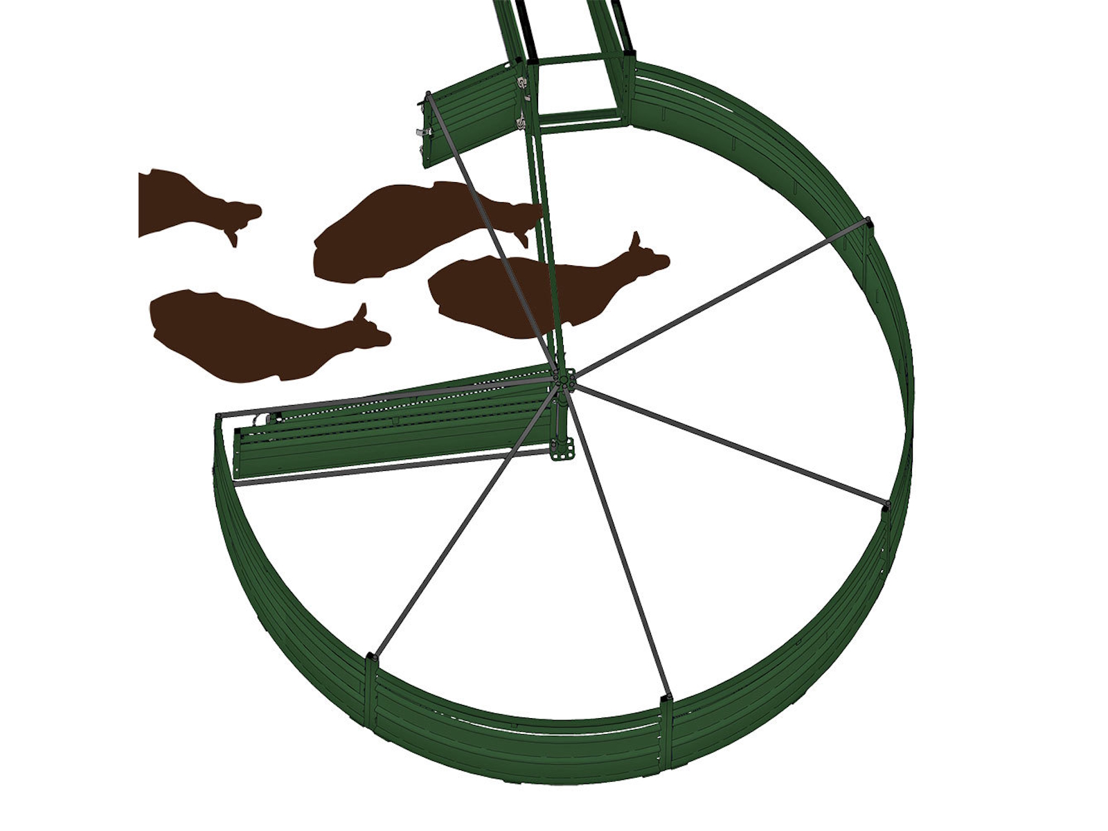 The cattle crowding tub is designed to be operated from the outside, allowing the handler to guide cattle into the alley system by utilizing point of balance handling techniques through the railings. If needed, the crowd gate can be activated to assist in directing cattle into the right direction without having to be inside the tub. For added safety, the crowd gate features a lock that prevents cattle from pushing back against the gate.