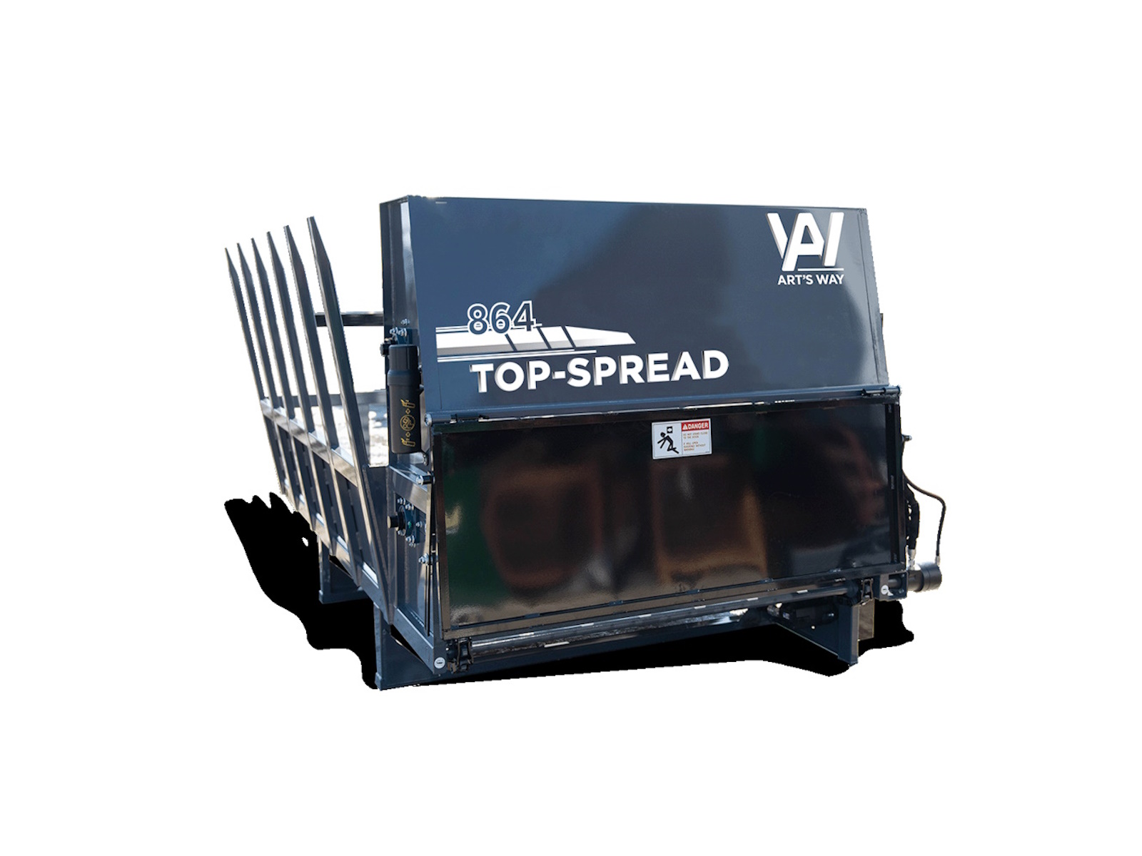 The 864 bale processor is built with tight spaces in mind. The full length across your skid steer is 123 inches. It extends out from your skid steer 67 inches – holding up to a 5′ x 6′ round bale or a 4′ x 8′ square bale. The deflector door is adjustable to lower during transport and raise up when spreading. The 864 weighs 2,260 pounds.