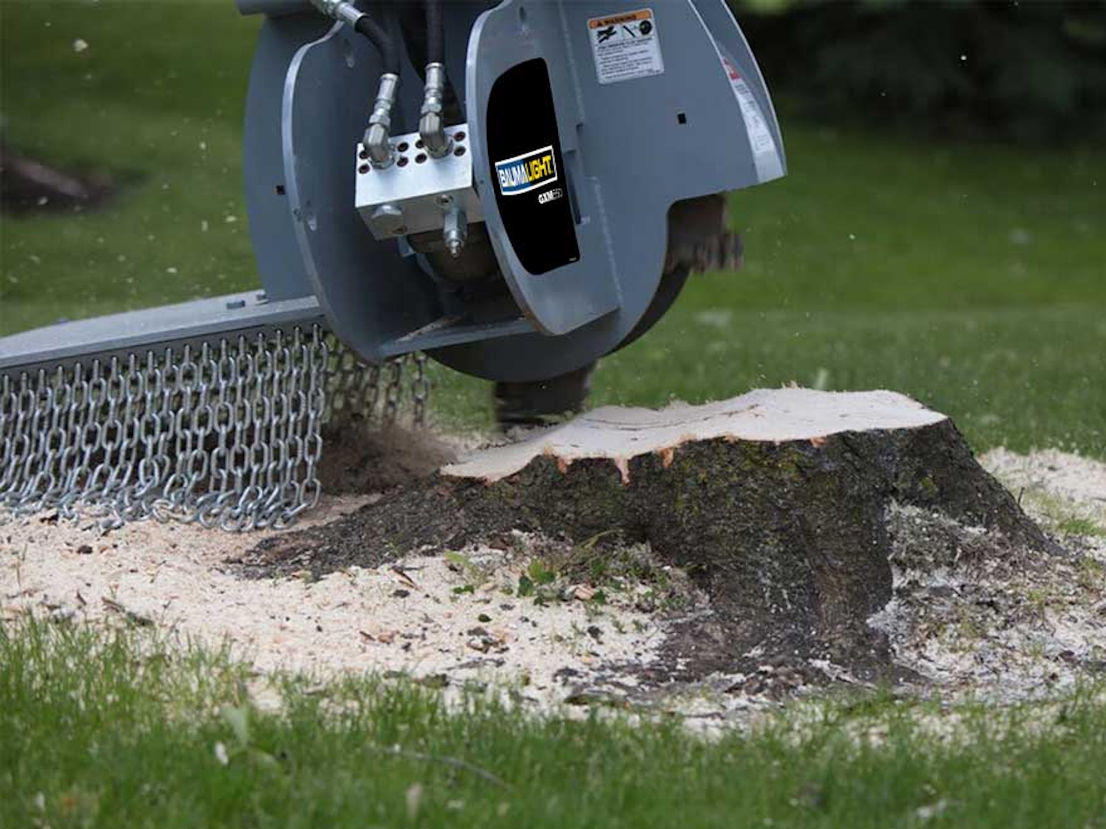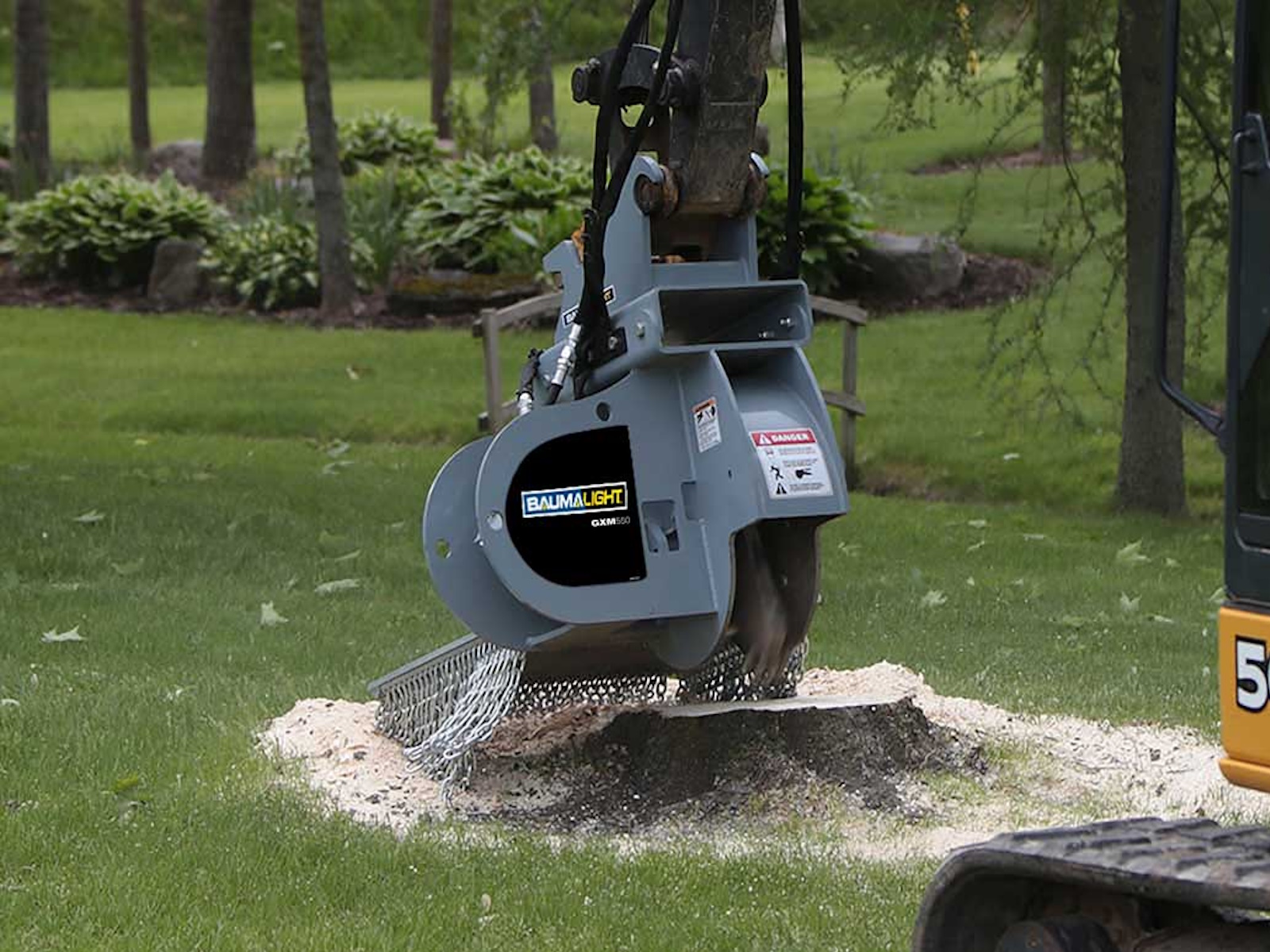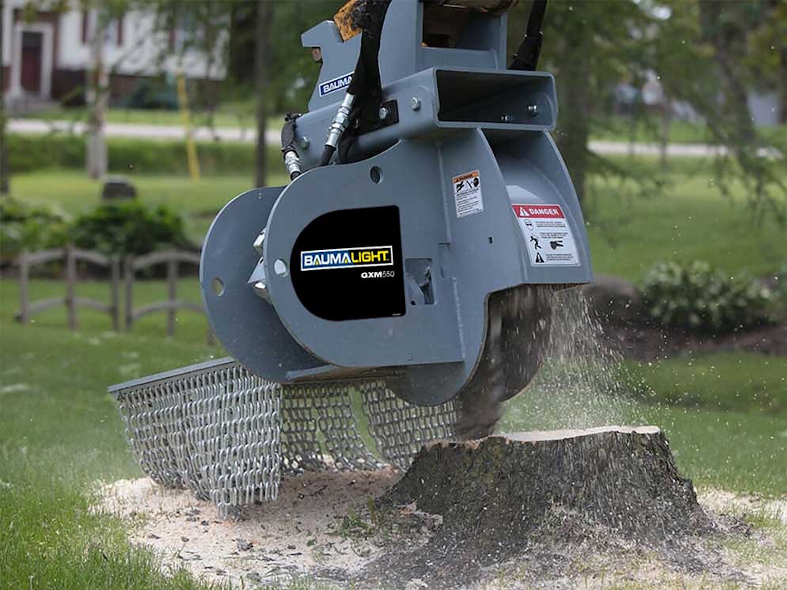 The 24" rotor is powered by a bent axis piston motor which provides ample stump grinding in virtually any location your excavator can reach. The extra-large blast shield provides maximum chip and debris control with a dual row of safety chain curtains. The massive 1.25" thick steel rotor provides the back bone for the Stump Grinder cutting system. It’s the anchor for the carbide tipped teeth. For smooth operation it’s important that the rotor remains solid, with no flexing. The rugged rotor also provides the Stump Grinder with the extra momentum needed when the grinding is tough, making sure the Stump Grinder can power through the hardest stumps. The GXM550 Baumalight stump grinder is offered with three motor options to best match your flow. A GXM550 with a motor of X510 having a PSI of 3000 can cut a stump of 24 inches in 25 mins at 12 GPM, whereas the same motor parameter and increased PSI of 4000 can cut a stump of 24 inches in 20 mins at 12 GPM. If the GPM is increased to 15, the time taken will be reduced.