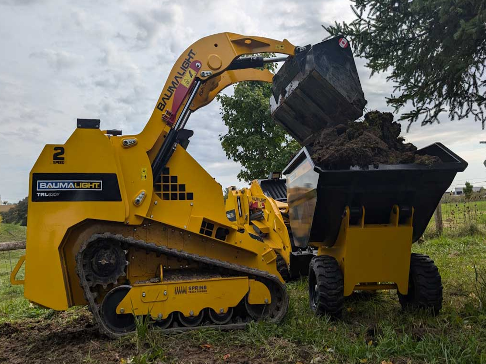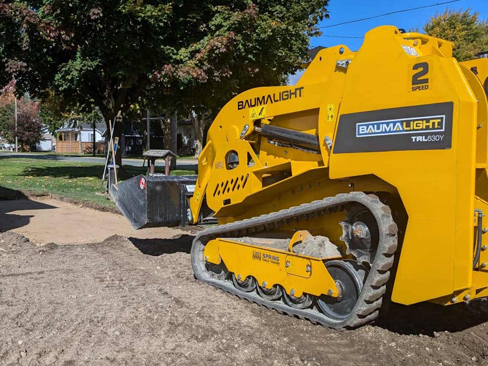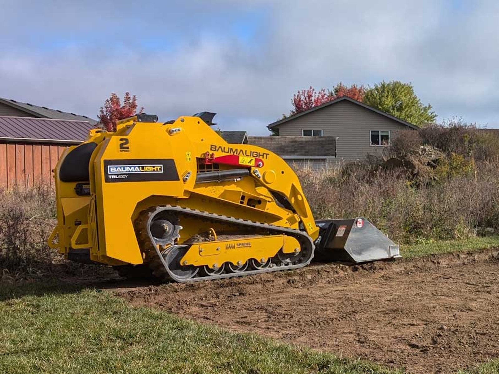 The hydrostatic drive is set up with two joystick controls with hydraulic pilot lines just like large skidsteers have. The remote hydraulic pump system with case drain delivers hydraulic flow that can be set to maximum engine capacity and the standard self-levelling bucket reduces spills and provides extra control when loading and unloading material. The Baumalight all metal frame mini track loader also features durable rubber tracks that can handle uneven or rough terrain, and floating ride-on platform for a smooth ride and improved visibility while maneuvering through confined areas.