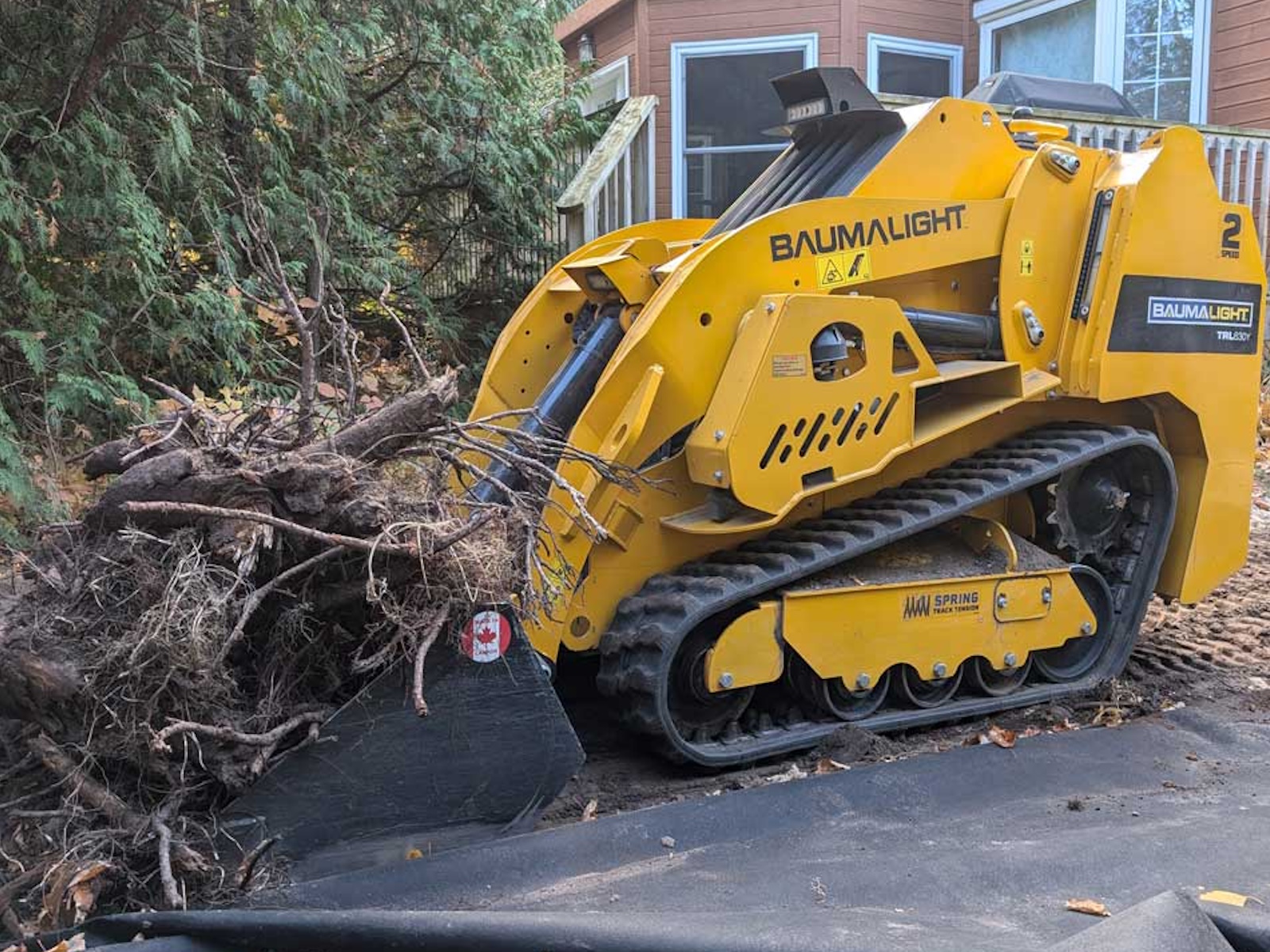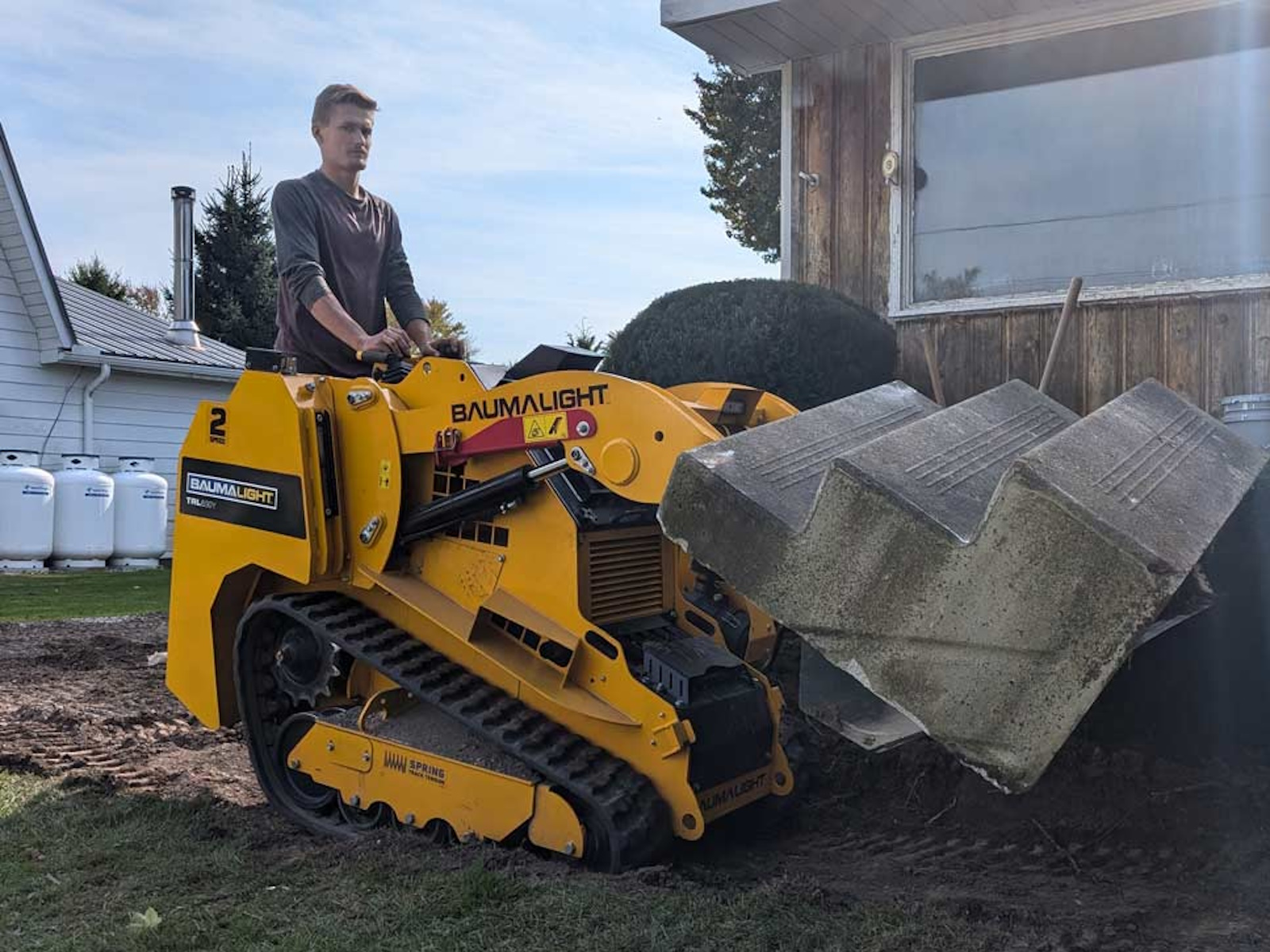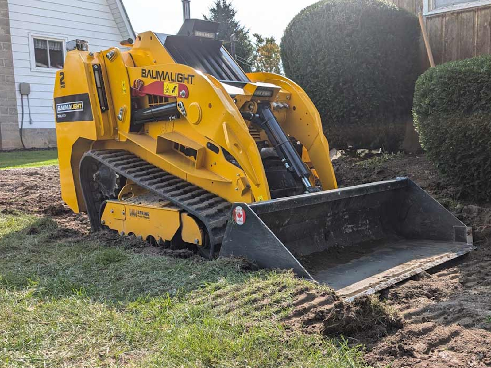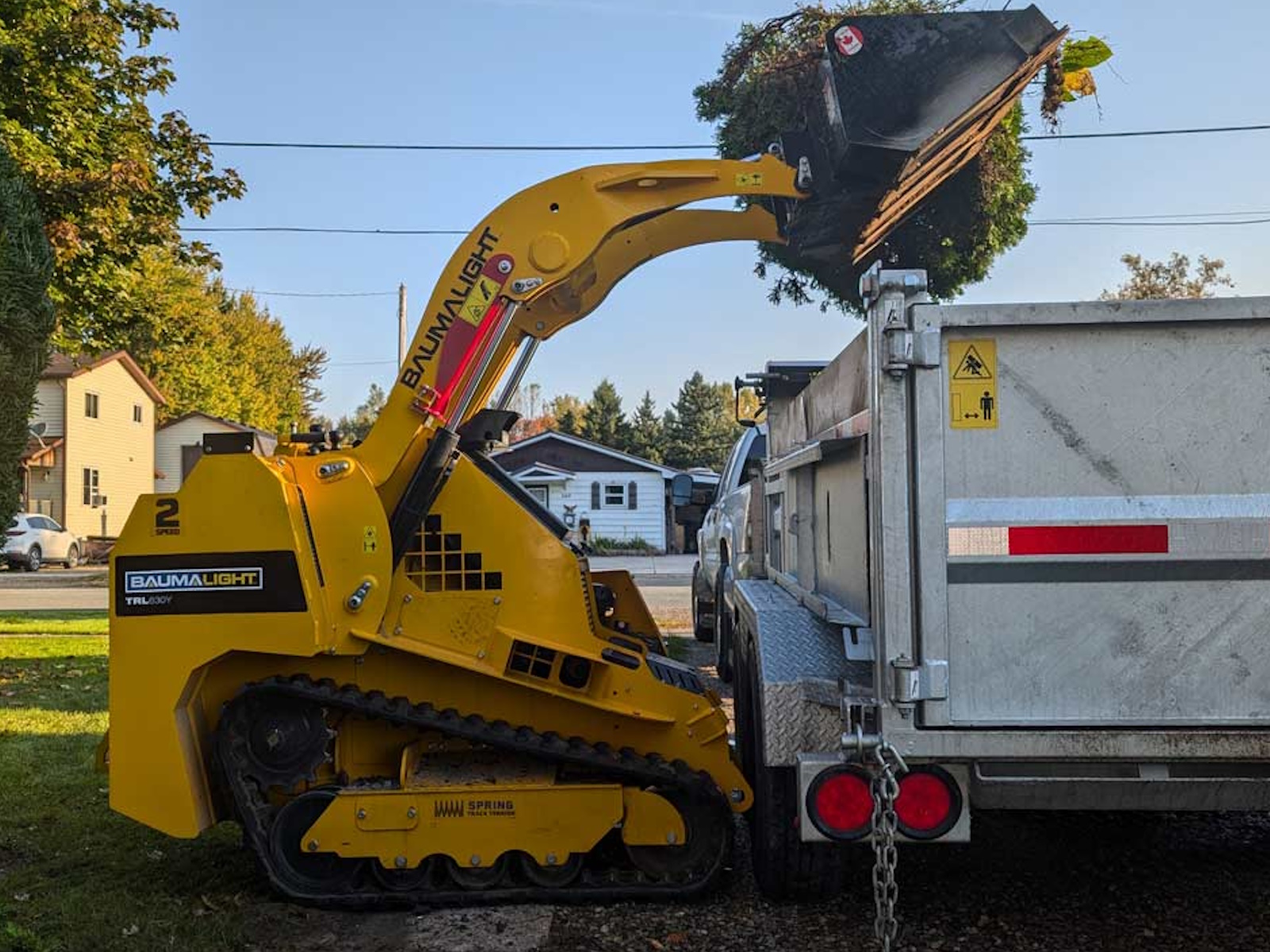 The hydrostatic drive is set up with two joystick controls with hydraulic pilot lines just like large skidsteers have. The remote hydraulic pump system with case drain delivers hydraulic flow that can be set to maximum engine capacity and the standard self-levelling bucket reduces spills and provides extra control when loading and unloading material. The Baumalight all metal frame mini track loader also features durable rubber tracks that can handle uneven or rough terrain, and floating ride-on platform for a smooth ride and improved visibility while maneuvering through confined areas.