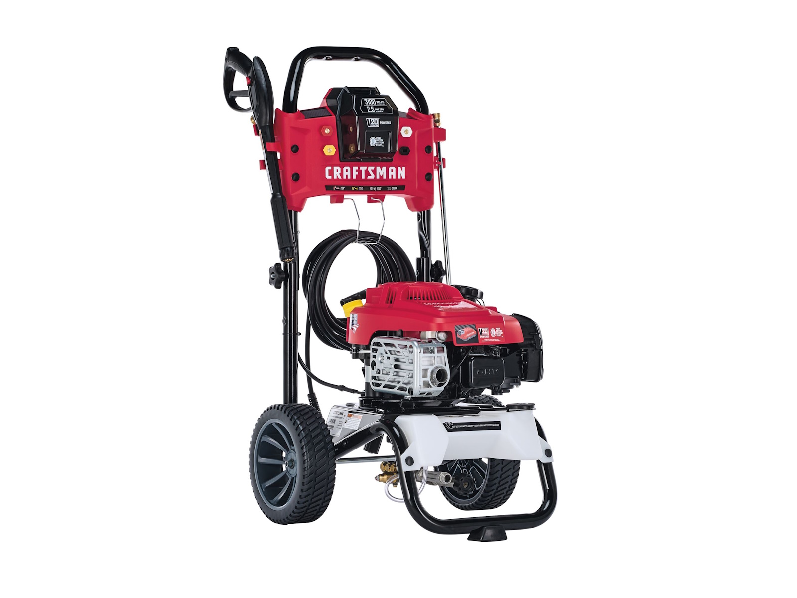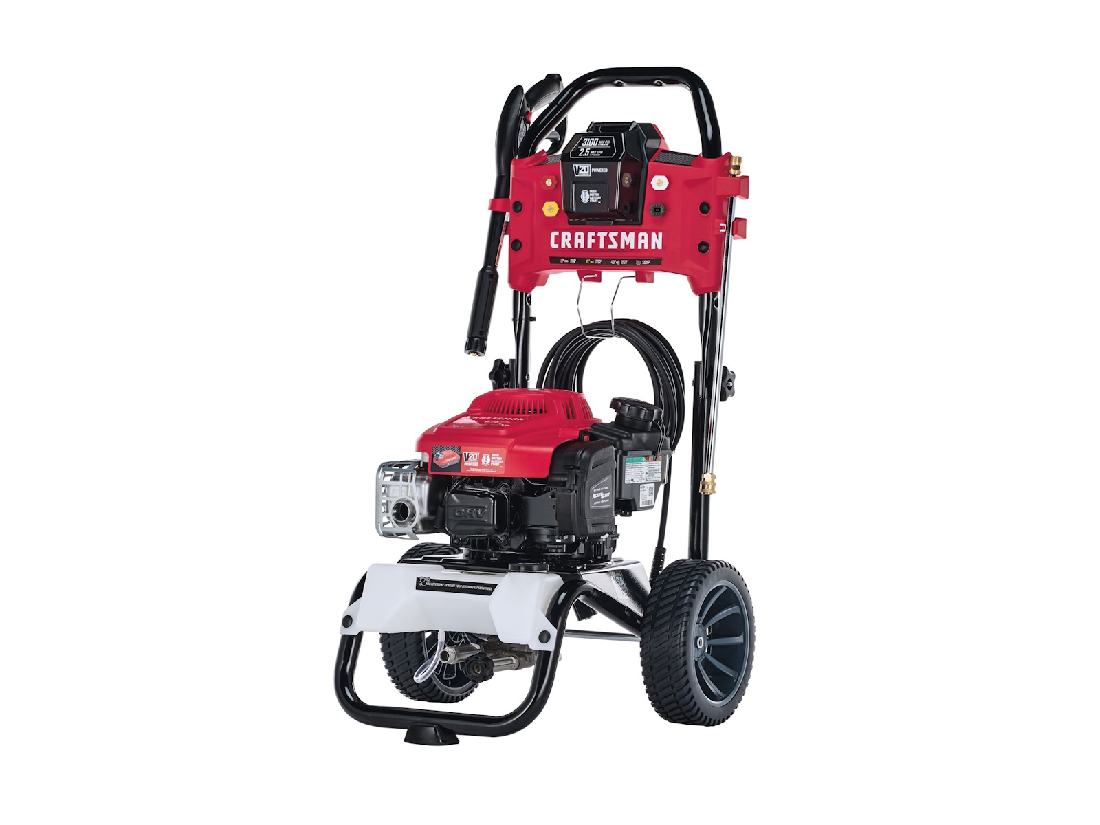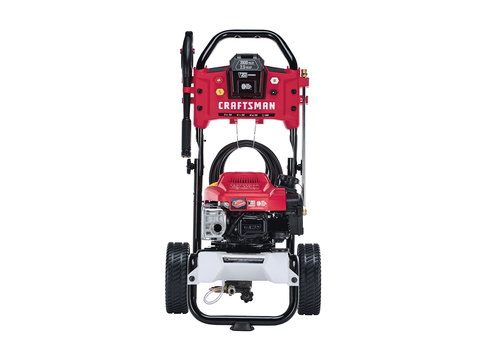 The V20* Battery-Start Pressure Washer powered by a reliable Briggs and Stratton engine provides the power you need to tackle your everyday residential cleaning projects. Four quick-connect nozzles allow you to quickly adjust the spray pattern to best fit the task at hand, and the 1/2-gallon detergent tank can be used with your preferred concentrate to boost your cleaning potential. The V20* battery allows you to crank up the unit at the touch of a button. This versatile battery can also be used with outdoor power equipment and power tools in the V20* system. Made in the USA with global materials.