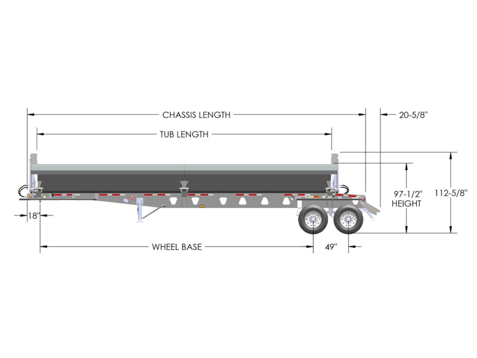 Tandem axle side dump trailers remaining more stable when pulled at higher speeds, particularly for highway conditions and operating in construction sites. These side dump variations are available in spring ride or air ride suspensions. Multiple trailer lengths, tub lengths, and tub capacities are also available.