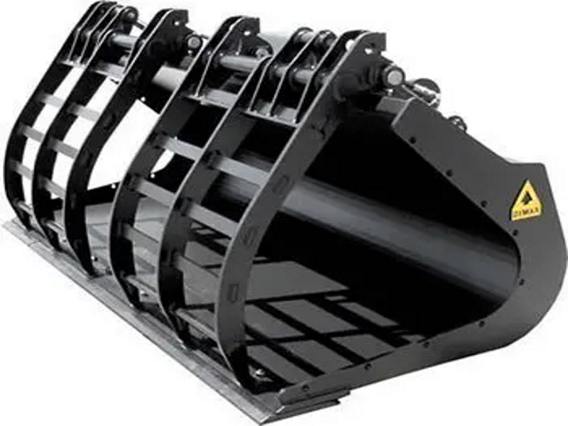 Dymax Scrap Handling Grapple Buckets feature two piece, independent top clamps with solid steel tine construction. Each grapple bucket is powered by two large cylinders which firmly grip and hold awkward, hard-to-load materials. Grapple arms retract behind the leading cutting edge for loading against objects such as concrete walls or large piles of rubble.