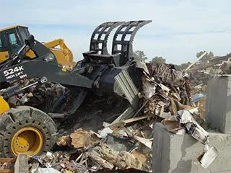 Dymax Scrap Handling Grapple Buckets feature two piece, independent top clamps with solid steel tine construction. Each grapple bucket is powered by two large cylinders which firmly grip and hold awkward, hard-to-load materials. Grapple arms retract behind the leading cutting edge for loading against objects such as concrete walls or large piles of rubble.