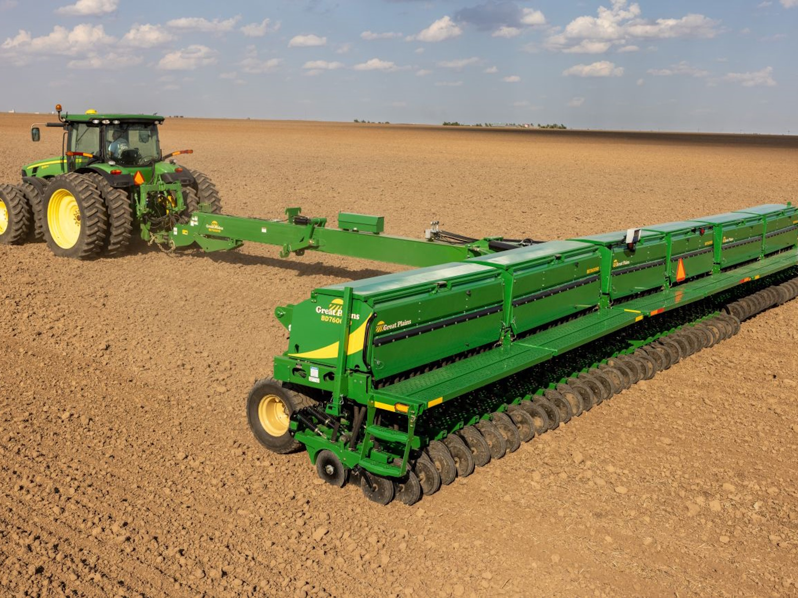 Great Plains has revolutionized the folding box drill once again to give large-scale operations maximum productivity and efficiency in the field. The BD7600 features a new split-box configuration and a larger capacity — up to 3.8 bu./ft. Newly designed feeder cups handle all types of seed and fertilizer with greater accuracy and consistency. With optimum flexibility over terraces, the BD7600 offers producers legendary durability, seeding performance, and a variety of options.