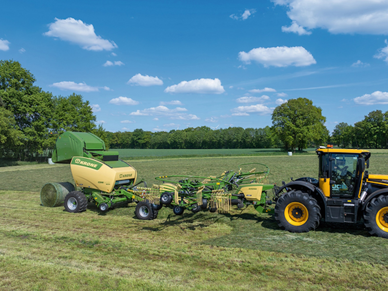 For the first time, a manufacturer is combining a rake and round baler for single person operation with maximum automation and efficiency. This combination is based on the modified Swadro TC 880 twin-rotor rake from KRONE, which merges with a KRONE round baler to form a highly efficient unit. The sole requirement placed on the baler is the ability for bottom hitching using a K 80 ball-head hitch and a PTO drive operating at 540 rpm.