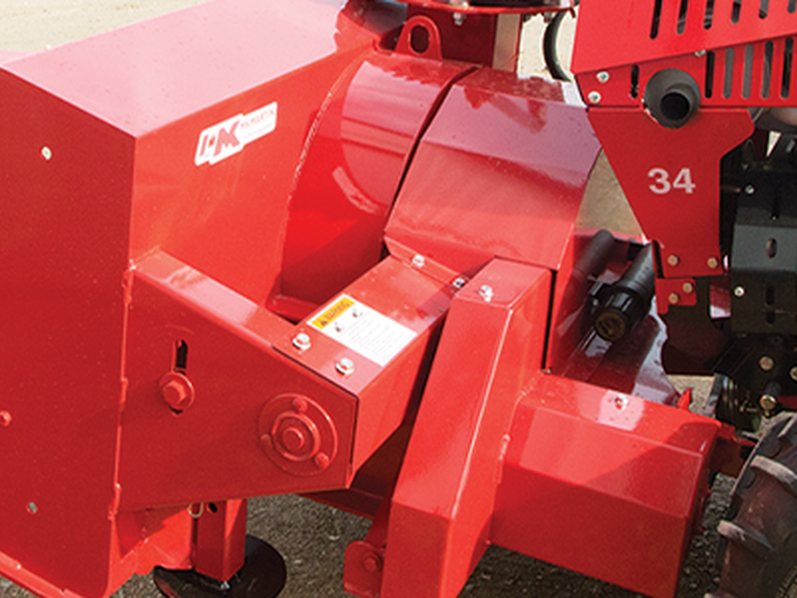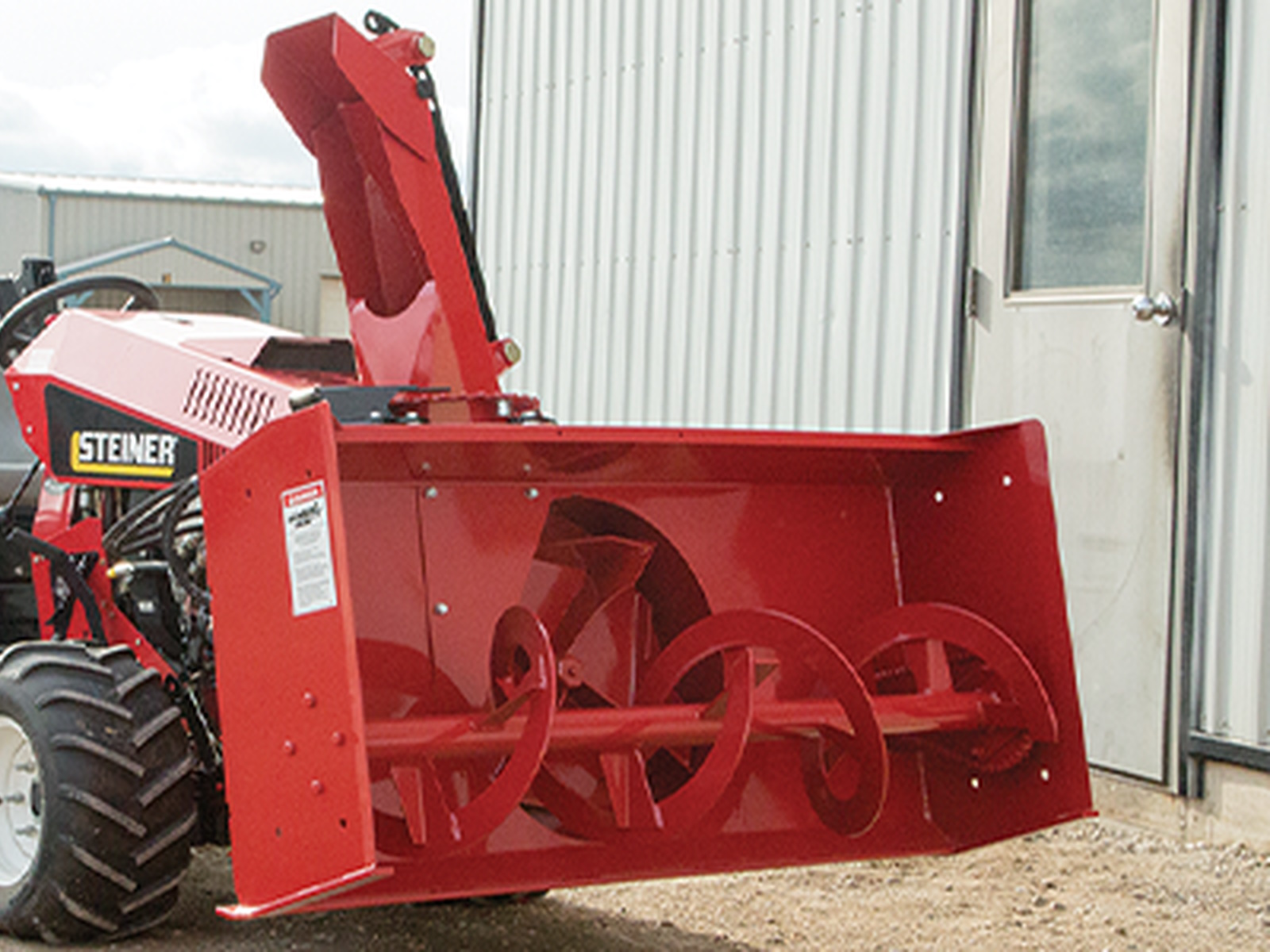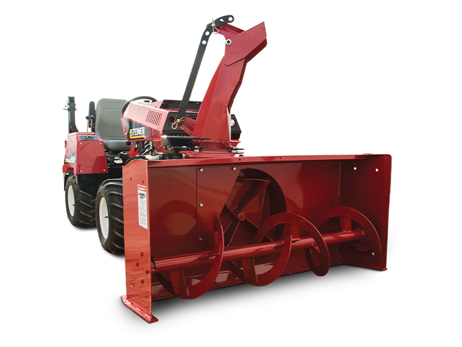 An MK Martin Snowblower specifically designed to fit Steiner and Ventrac tractors. Equipped with hydraulic chute rotation, it provides a smooth blowing experience, ensuring efficient snow removal ideal for rural driveways and smaller commercial yards.
