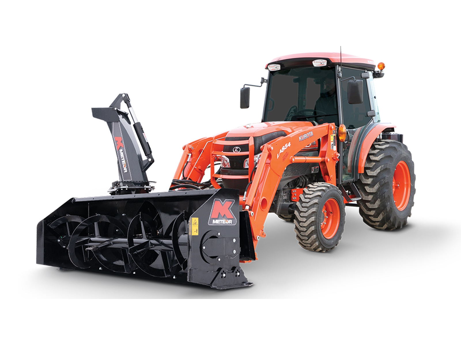 The loader mount Meteor is the ideal snow blower package for owners of small tractors equipped with loader arms. The package includes a self contained PTO driven power pack to drive the hydraulics required by the snow blower.
