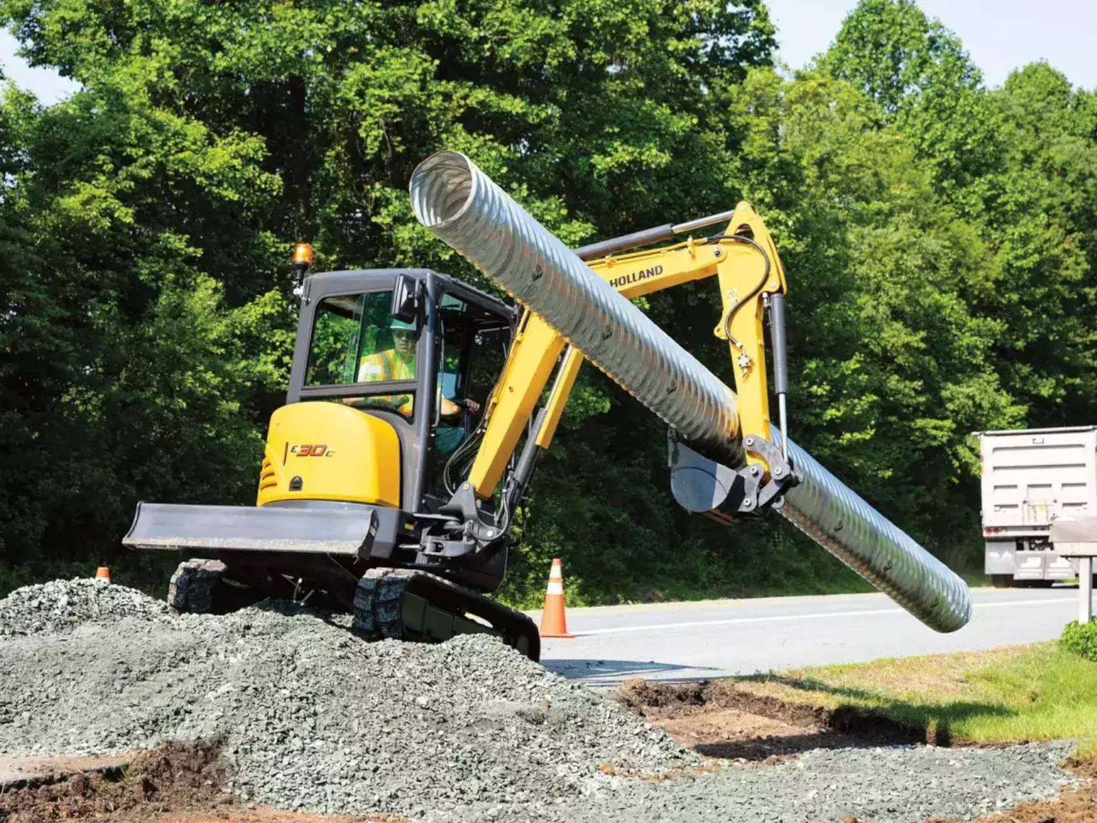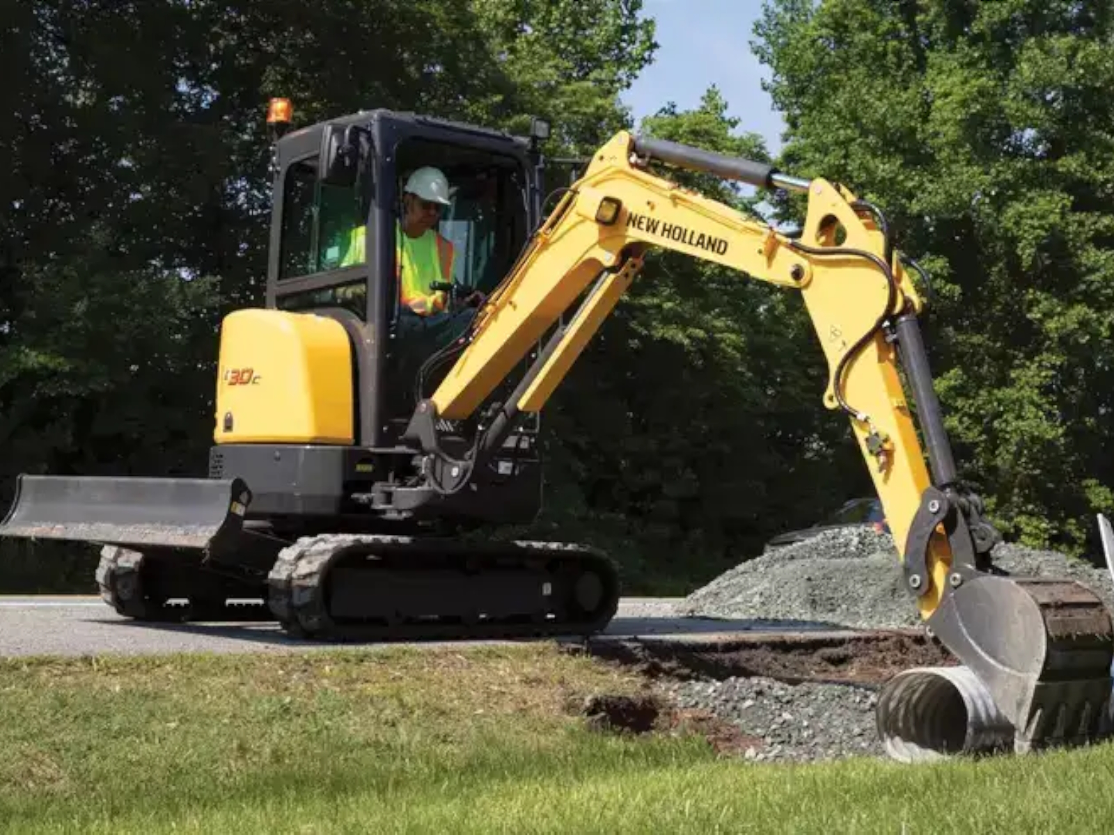 New Holland's E30C compact dimensions and digging capabilities combine power and versatility to seize every moment of your work day. Designed for day-long performance, this mini excavator has class-leading excavation talent with the adaptability to support a wide range of attachments.