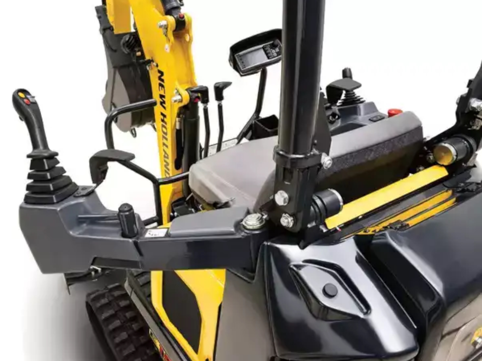 New Holland's E30C compact excavator can be fitted with either a canopy or full cab. The cab carries a 6,922 lb (3140 kg) operating weight and a 6,592 lb (2990 kg) operating weight on the canopy with rubber tracks, full fuel tank, operator and bucket. Additionally, the E30C is TOPS (tip-over), FOPS (falling-object) and ROPS (roll-over) compliant to protect the precious cargo inside. Low noise and vibration levels, an adjustable suspension seat, adaptable wrist rests and Bluetooth® radio* ensure you can work for extended periods in comfort with no compromise in operator safety.