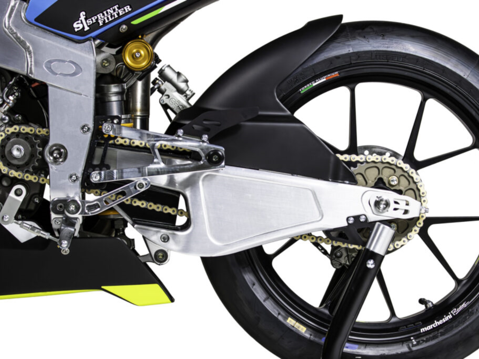 Aluminium swingarm with linkage Fully adjustable monoshock (spring preload, compression and rebound dampin