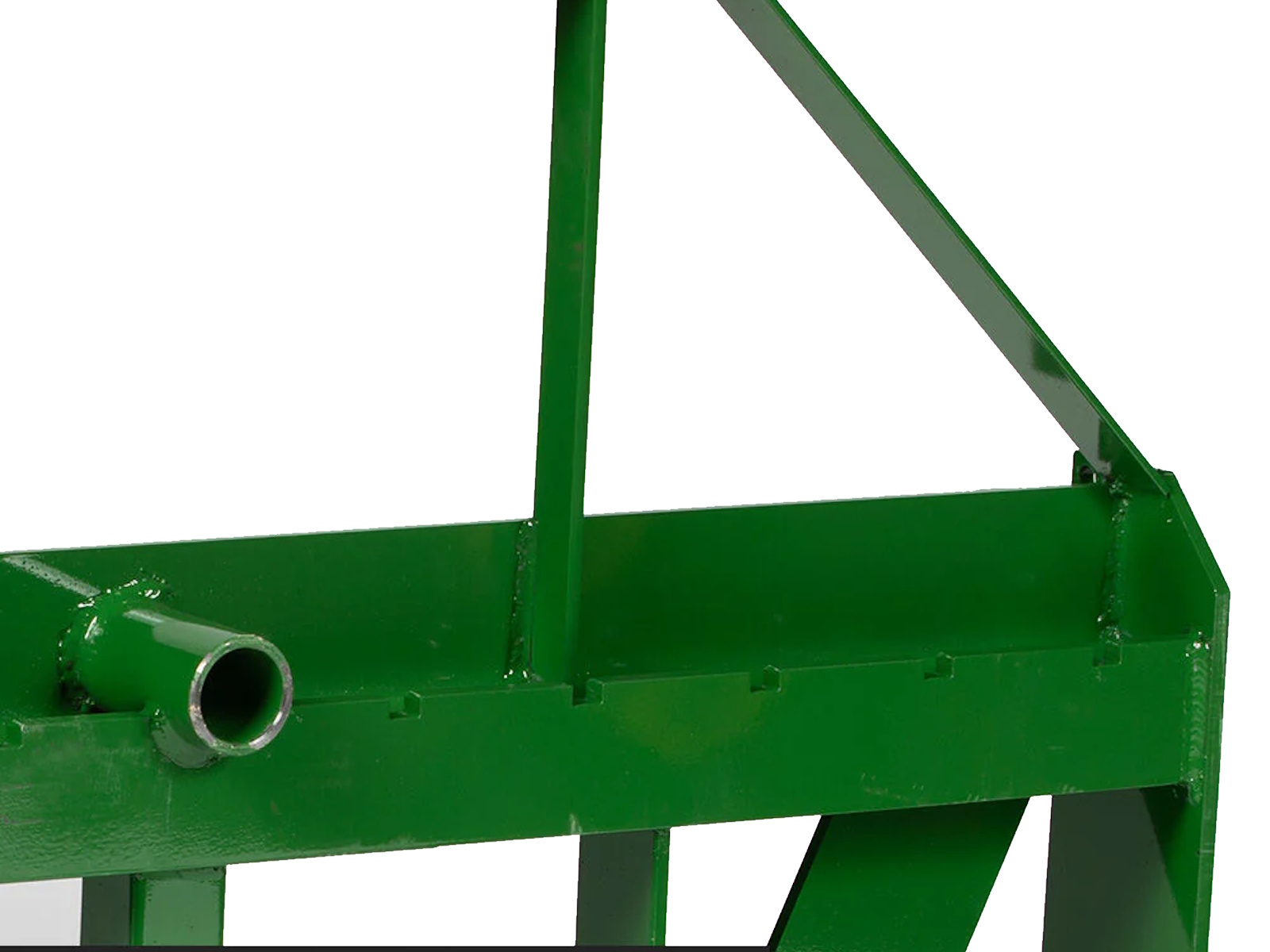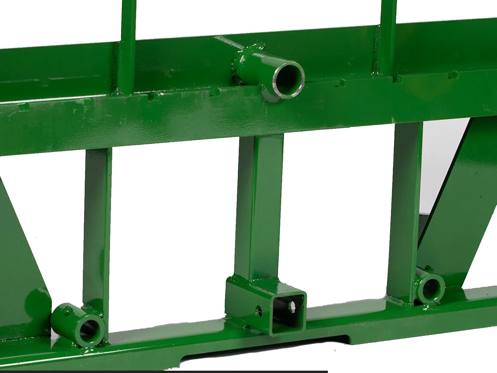 This all-in-one Standard Series USA Made Pallet Fork Frame Attachment is designed to fit John Deere tractors equipped with the Global style mounting system, also known as the Euro mounting system. The hay frame attachment features a 2-inch receiver hitch and sleeves for installing hay bale spears and slotted carriage bars for mounting class II pallet fork blades. A see-through headache rack is welded to the frame to increase its durability and capacity and add security to your loader arms. No need to worry about logs, hay bales, and other items that are being transported from falling back on your loader arms. All of these will come standard with this hay frame attachment. There is no need to have a frame for hay bales, one for moving pallets and debris, and another for moving trailers. Use this one frame to replace them all!