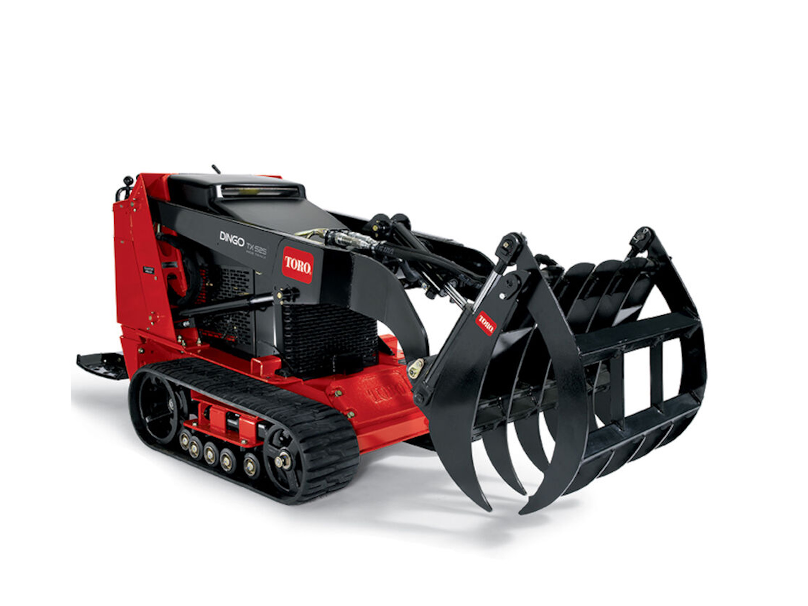 The Toro grapple rake attachment allows operators to grab, drag, lift, and place materials with ease. The grapple has two heavy-duty cylinders capable of producing 3000 pounds of clamping force at the tine tips, insuring you can "grab-ahold" and not let go.