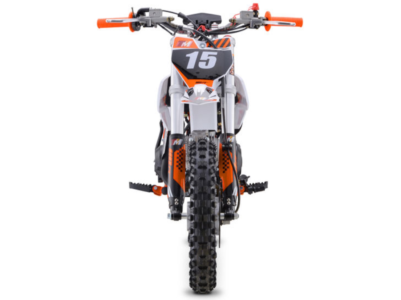 The TM 15‐110 (SEMI‐EStart) is a great Junior size dirt bike. It has a high performance 110cc 4 stroke 6 hp engine with Electric & kick start and a seat height of 24”. It is available in red, blue, green, and orange colors. The TM15 features a Semi‐Automatic transmission with 4 gears (N‐1‐2‐3‐4), front and rear disc brakes, 12” front & 10”Rear Tire and a heavy duty frame built for durability! This is sure to be a HOT seller!
