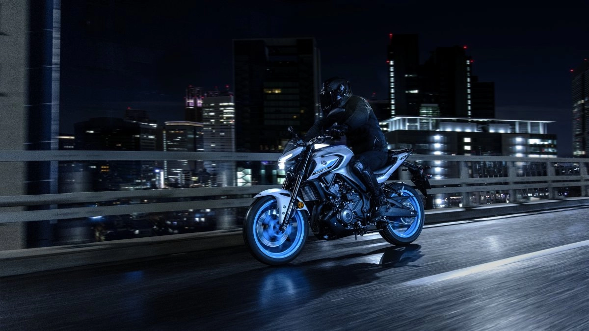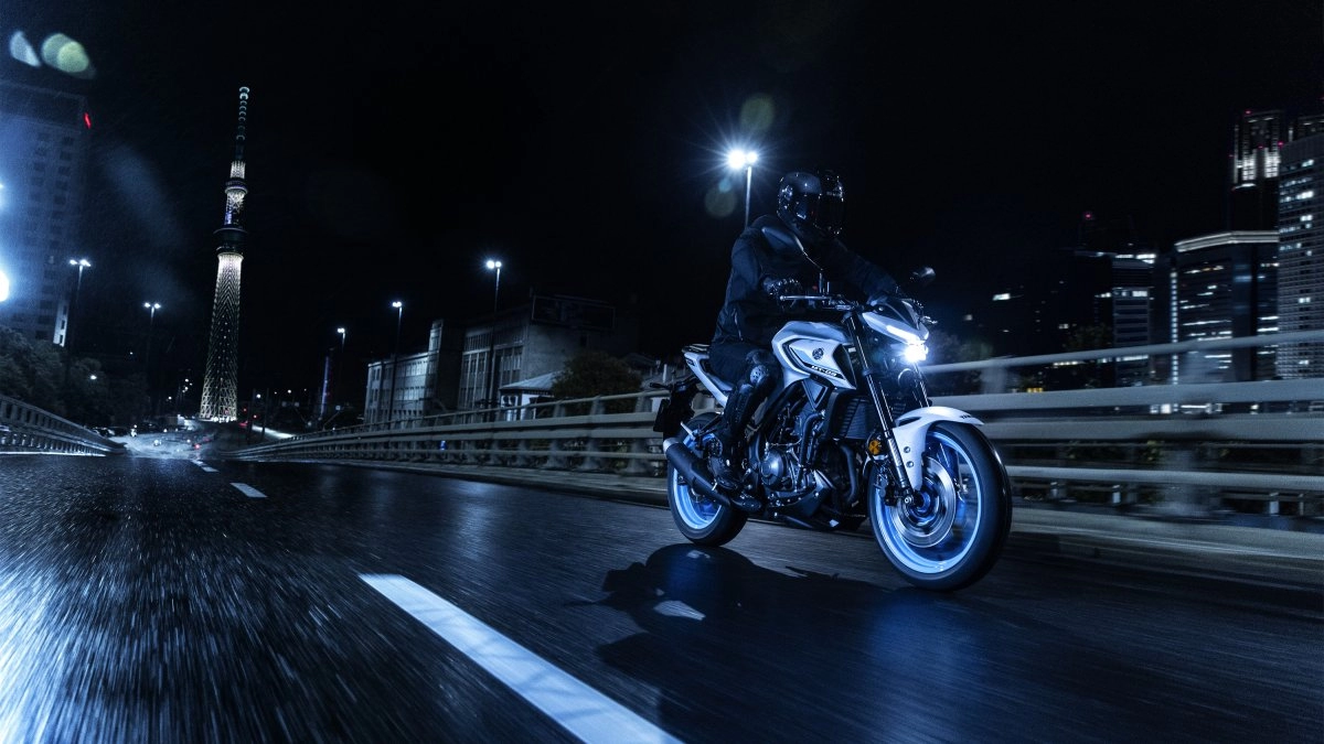 The dynamic MT-03 looks cool with its dual angled position lights that emphasize its aggressive big-bike looks. A single compact and powerful LED headlight burns a hole through the darkness to light up the road ahead.