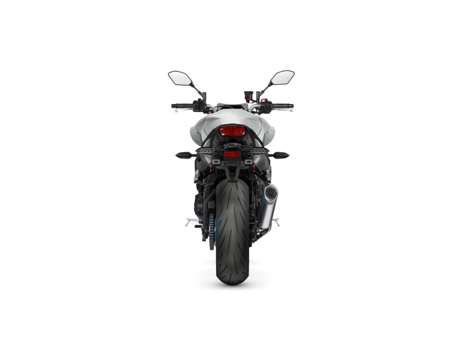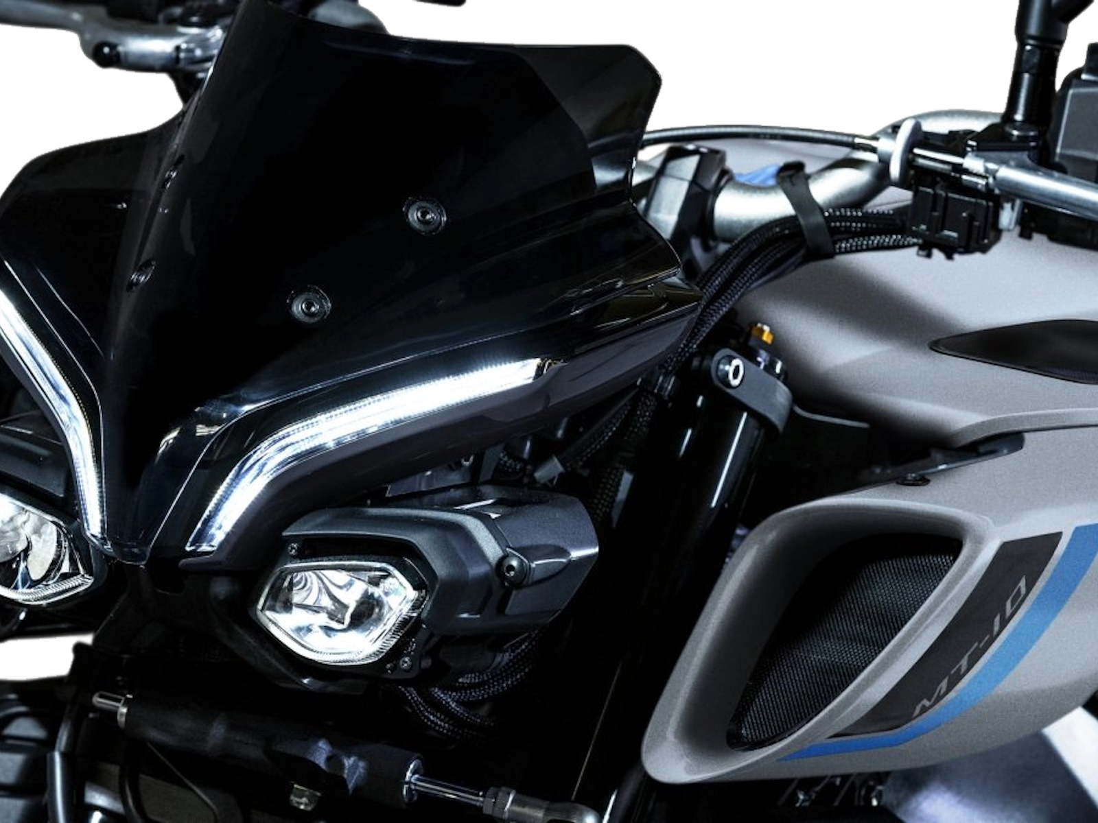 - A stripped-down look is achieved by removing unnecessary bodywork elements and refocusing attention on the pure mechanical beauty of the muscular engine and compact frame. Twin-eye mono-focus LED headlights and LED position lights situated above the headlights combine with a compact nose assembly to minimize overhang and lend a refined, dominant style. Enlarged, functional intake ducts mounted on either side of the fuel tank cover increase efficiency while further enhancing the bike's aggressiveness.