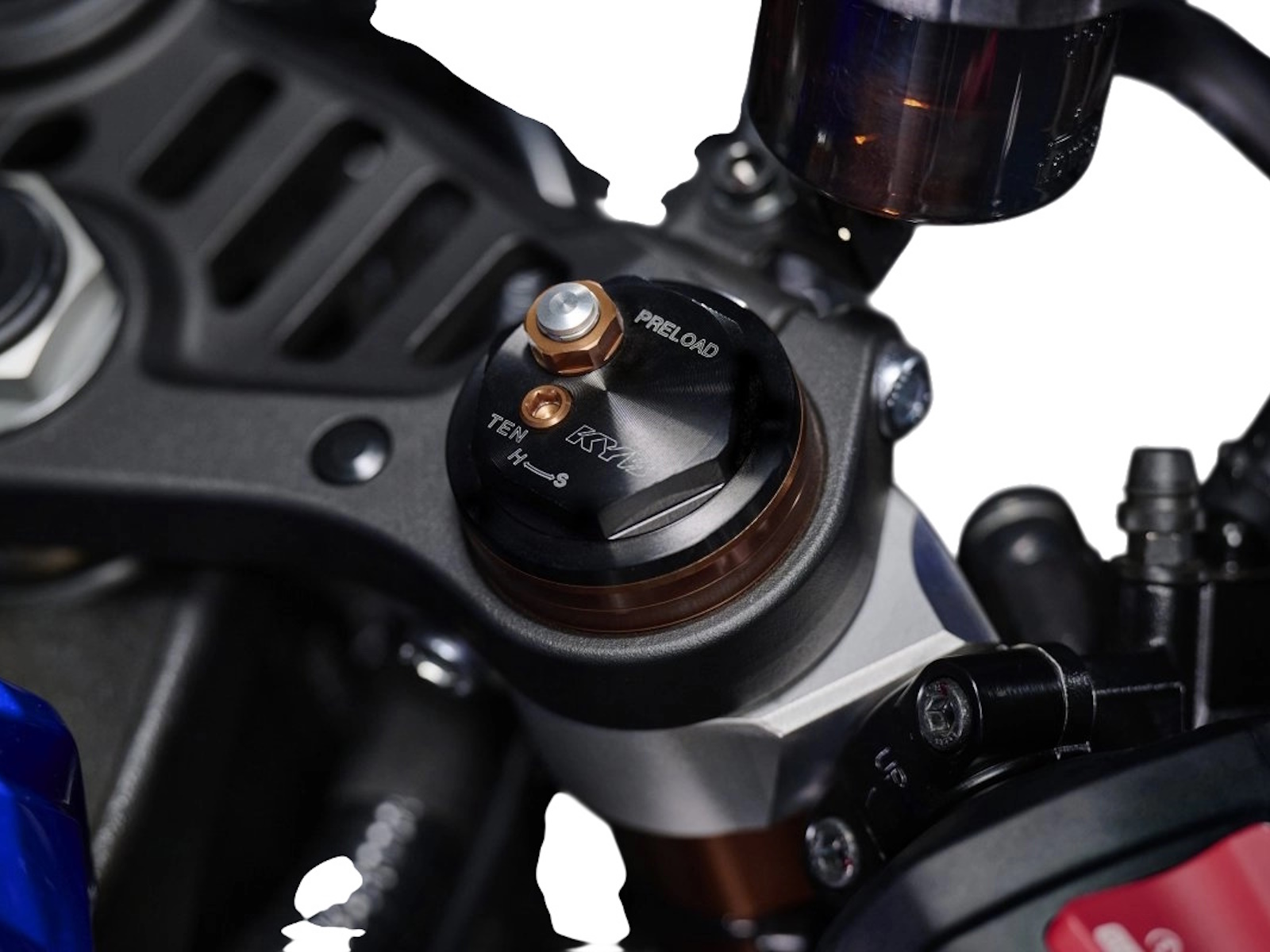 - High-spec 43mm KYB® front fork with a full range of adjustability including preload, high/low speed compression and rebound damping.