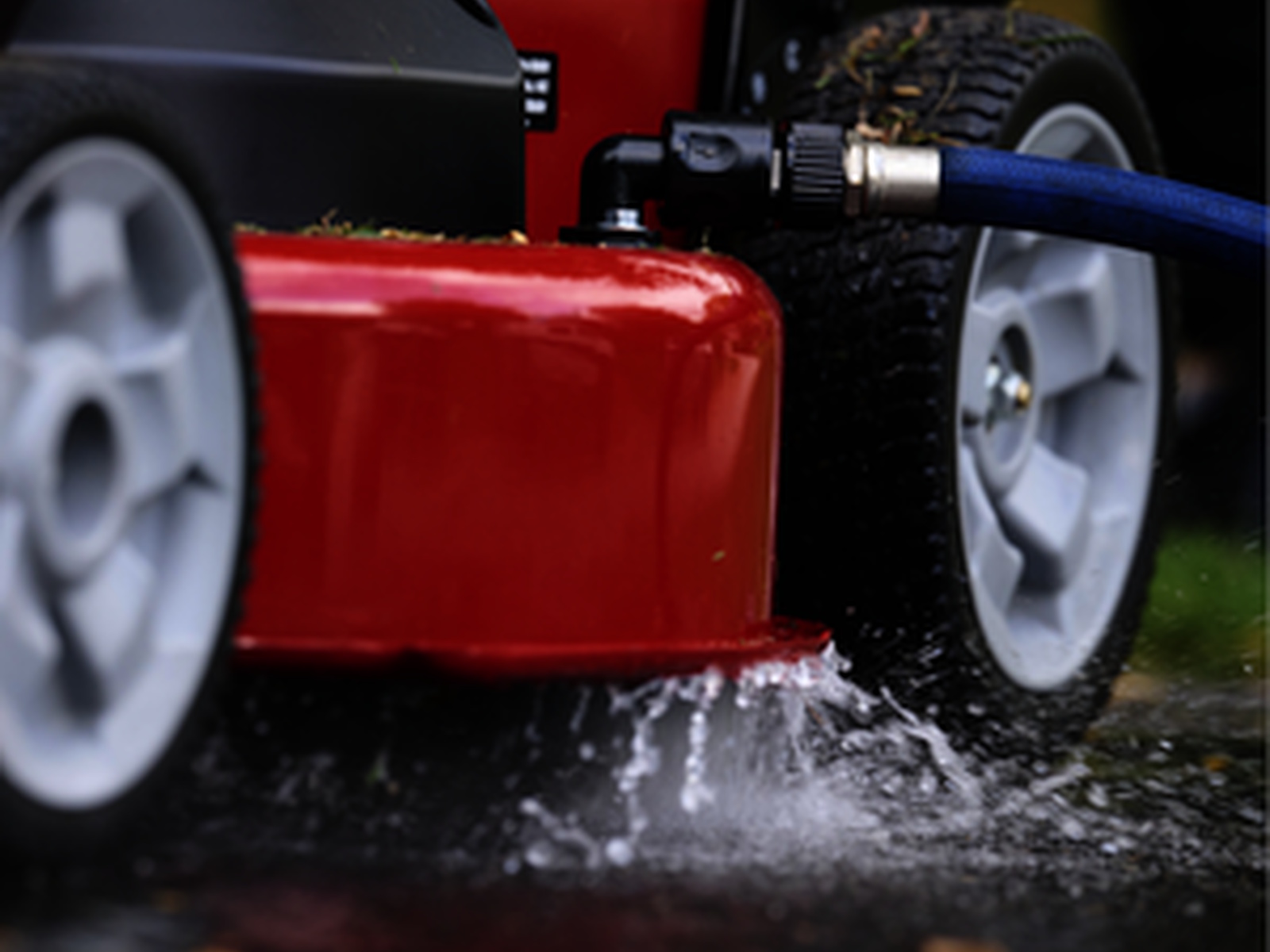- Attach a hose to the washout port on the mower deck to easily clean the under side.