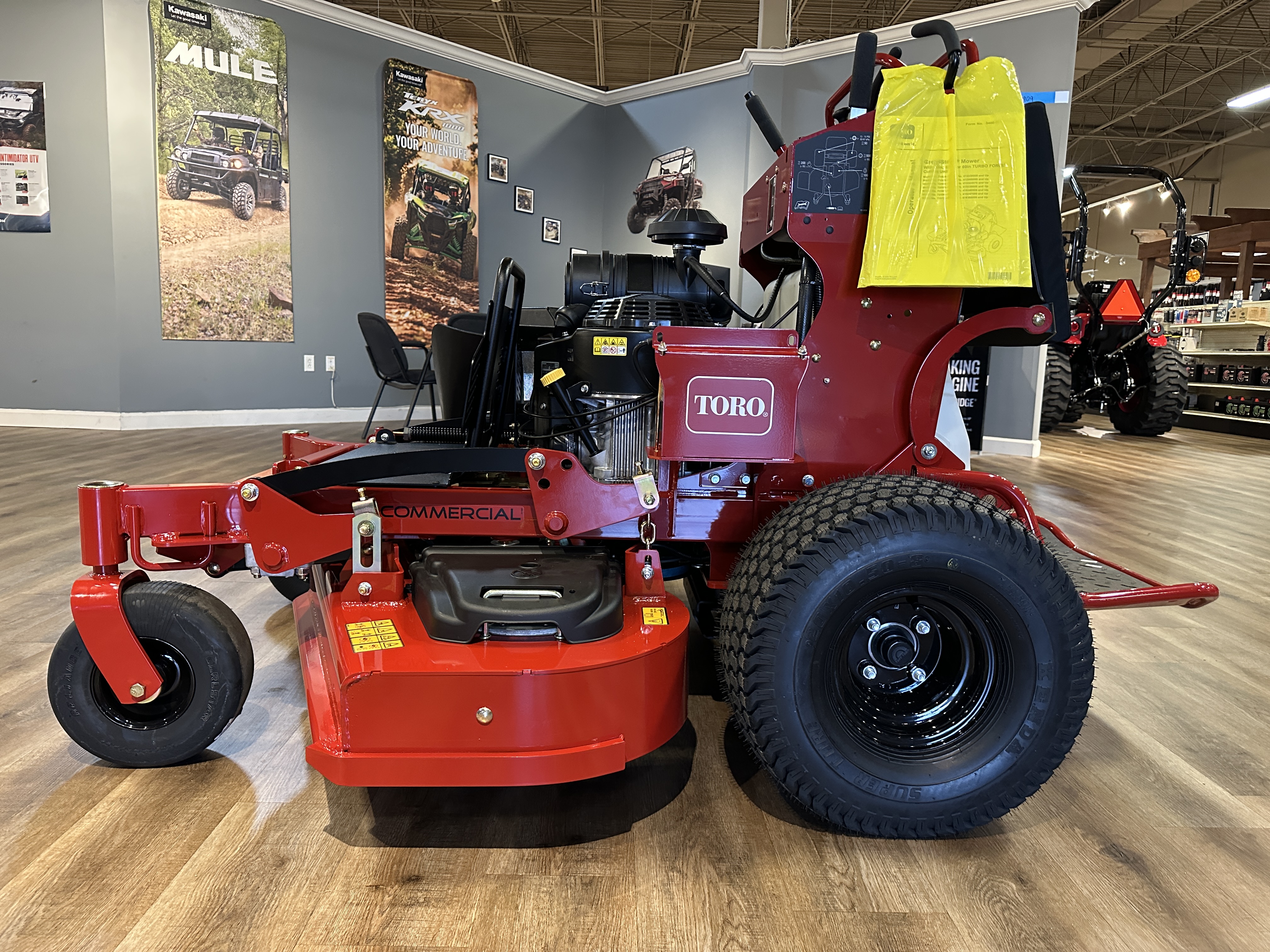 Rough bumps and challenging terrain are all in a day’s work. Feeling them shouldn’t have to be. The Toro GrandStand combines the speed and comfort of a zero-turn rider with the on-and-off ease of a wide area walk-behind — creating a fast, maneuverable and more productive alternative. And now the GrandStand is even better with all-new next generation upgrades that add up to higher productivity, lower maintenance and easier service. This mower has a 22 hp Kawasaki FX 726cc engine.