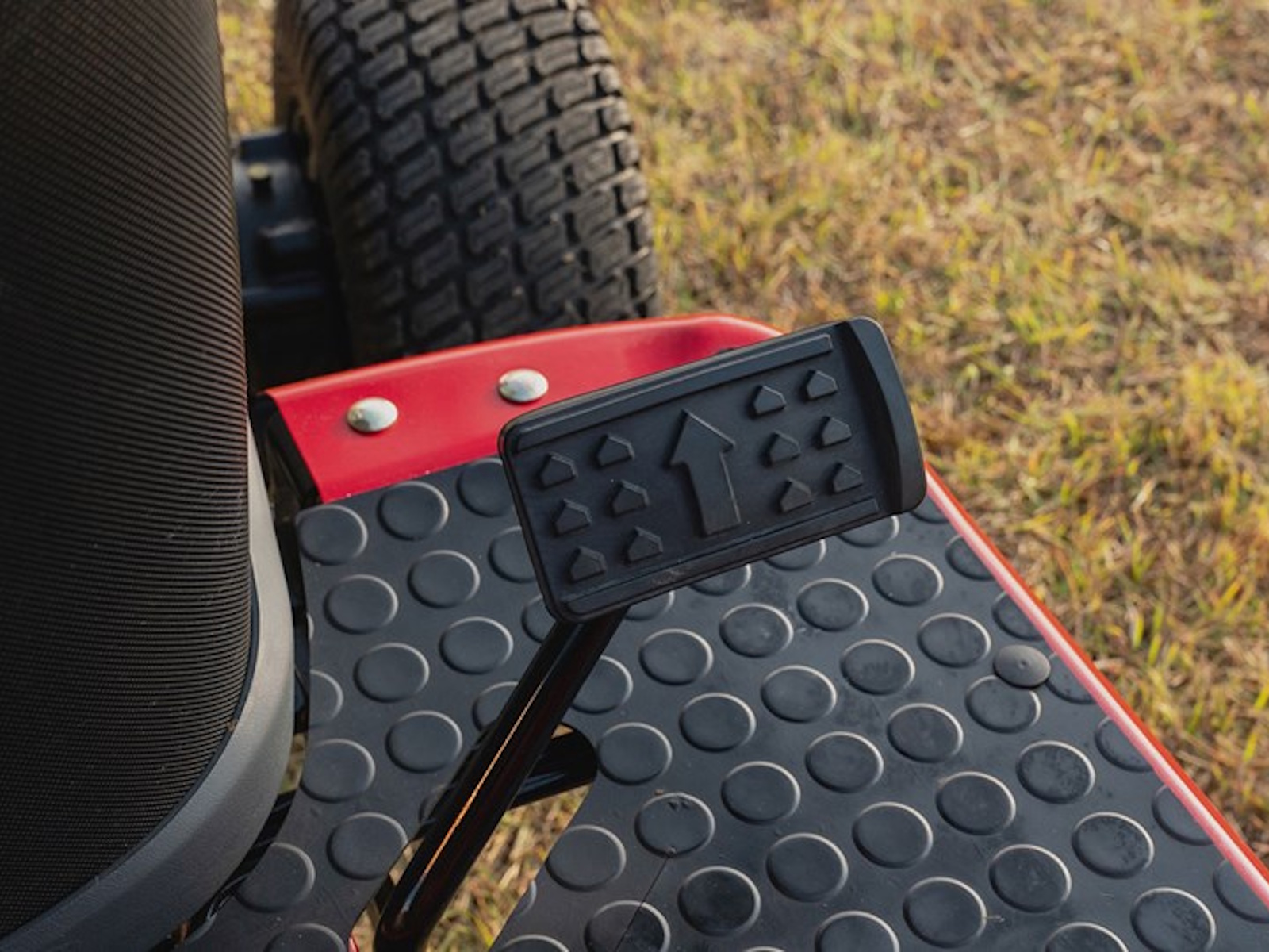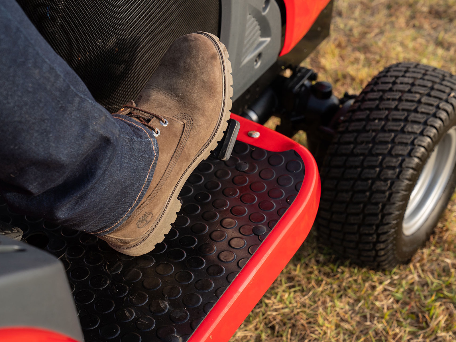 - Ergonomic features for enhanced productivity: A wide operator cabin with a flat floor offers good visibility and ample leg room, promoting comfortable operation. All controls are within arm’s reach, including a dial to control the cutting height of the mid-mount attachment. The accelerator, brake pedal, differential lock, and parking brake are easily accessible on the floor of the cabin, located precisely where you expect them to be. These features make this tractor easy to operate, even for novice drivers.