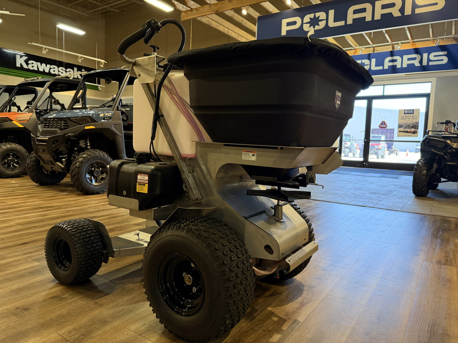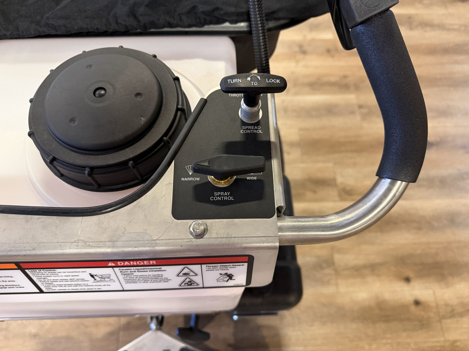 - Stainless steel resists corrosion from the granular and liquid chemicals distributed by the unit.