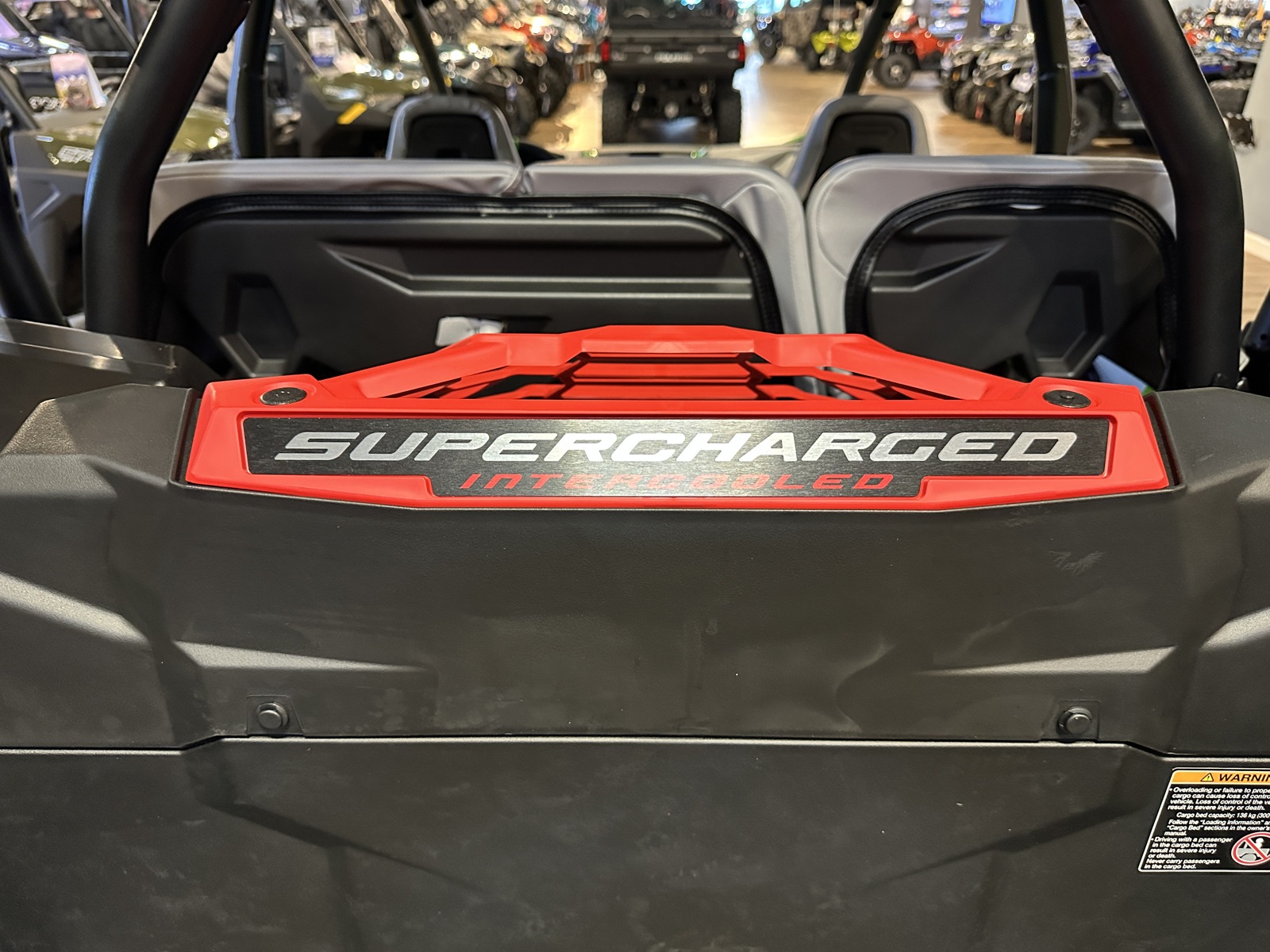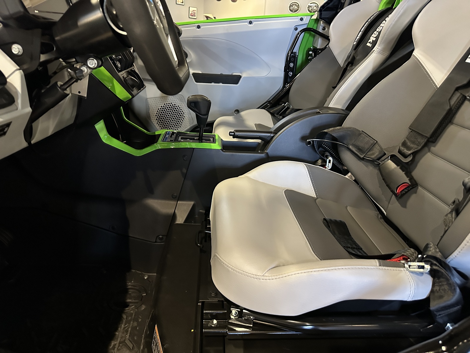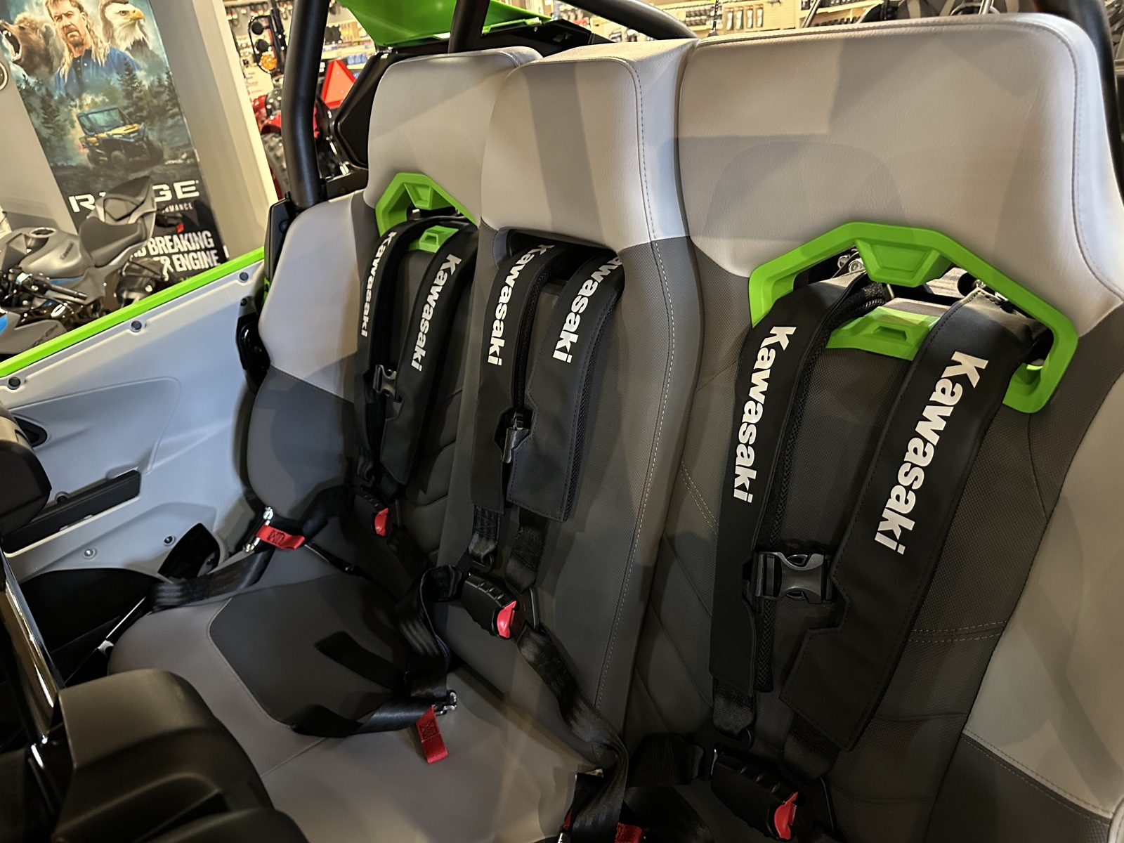 - 2 high-backed bucket seats up front, 3-person high-backed contoured sport bench seat in the rear, all equipped with 4-point seatbelts
