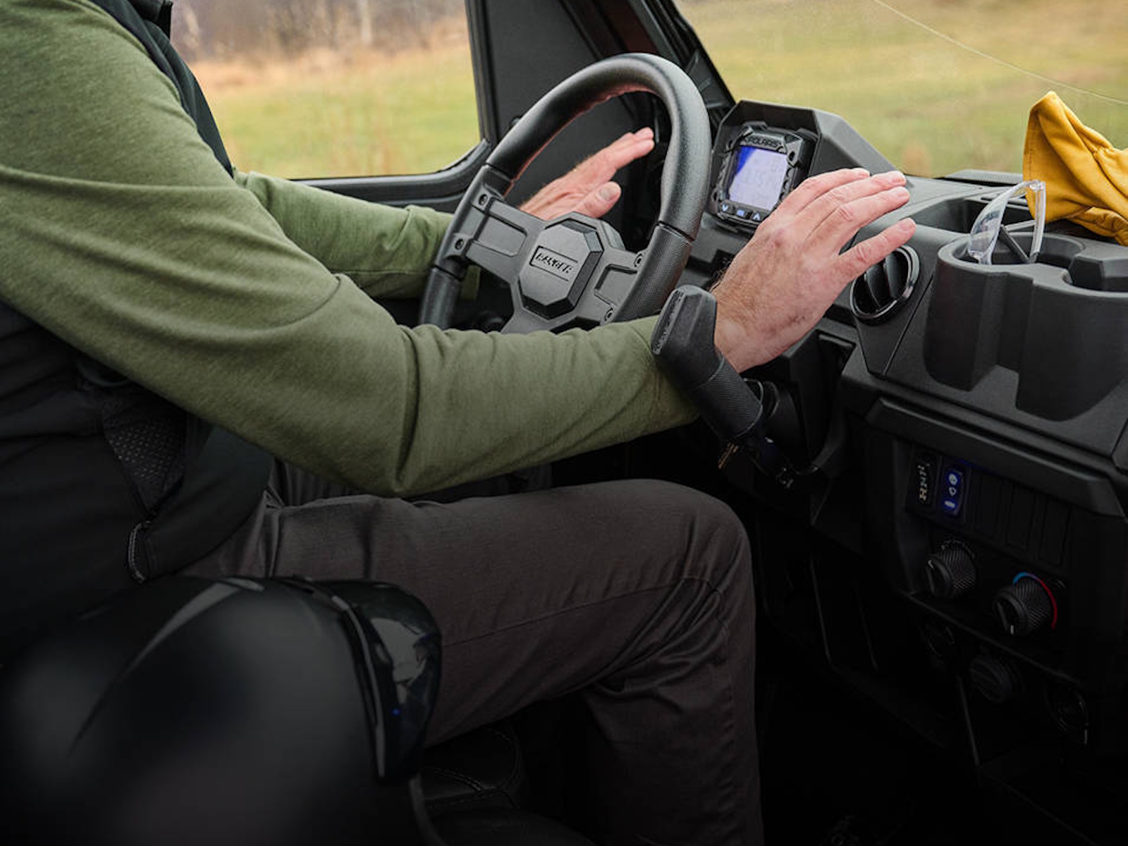 Ride more comfortably from sunup to sundown, thanks to a tilt steering wheel, plush seat cushions, and factory-installed roof (on Premium). Cab nets offer one-handed operation for easier entry and exit.