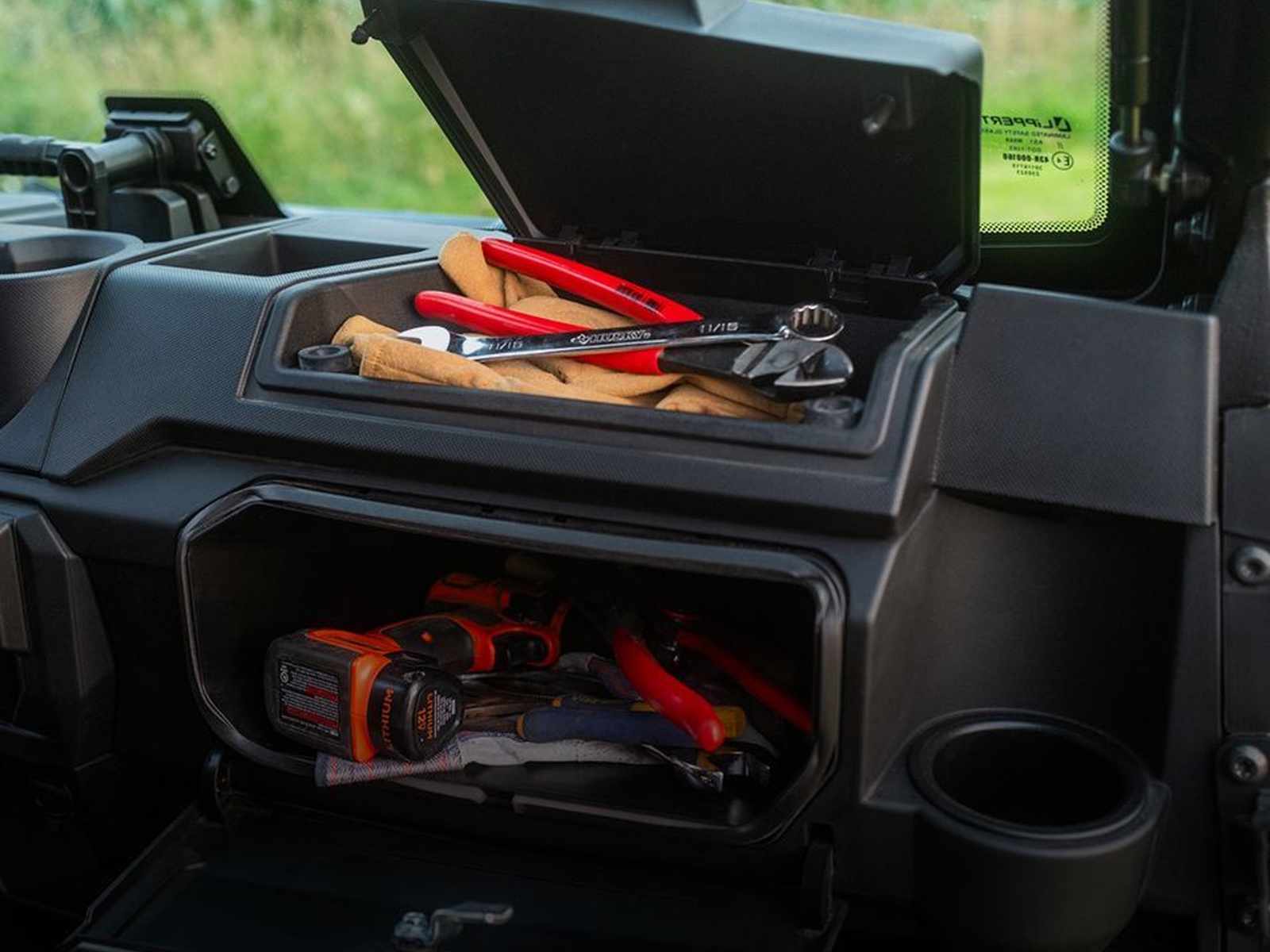 Take advantage of easy-to-access, in-cab and underseat storage for your gear. Place essentials in the dual-integrated glove boxes and keep beverages secure with up to 8 cup holders. Plus, charge your phone with the USB charging port.