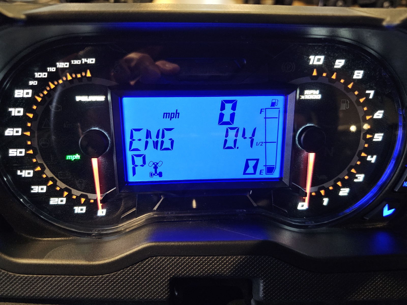 Dual-sweep analog dials with 4 in LCD rider information center: user selectable blue/red backlighting and brightness, passcode protection, programmable service intervals, speedometer, programmable speed limiting, tachometer, odometer, tripmeter, clock, hour meter, gear indicator, fuel gauge, coolant temperature, voltmeter, service indicator and codes, seat belt reminder
