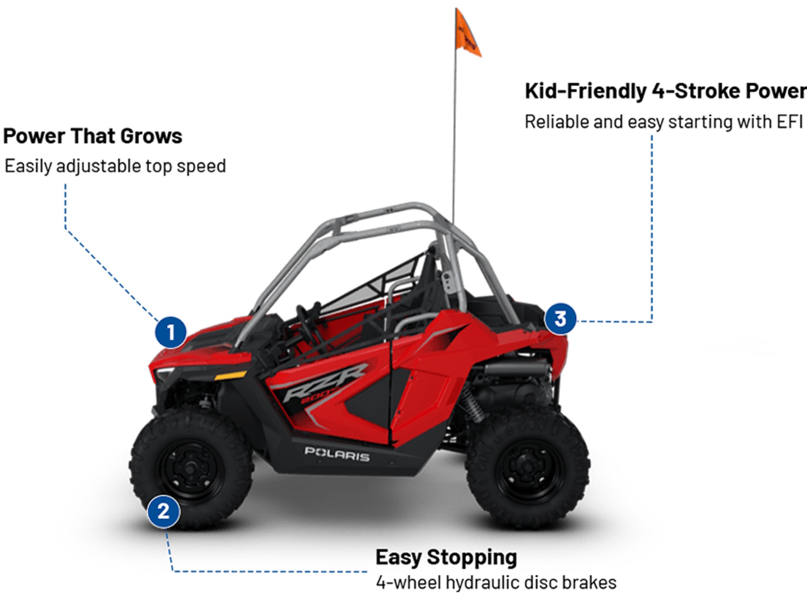With adjustable seating and steering wheel, the RZR 200 EFI will fit a range of younger riders.