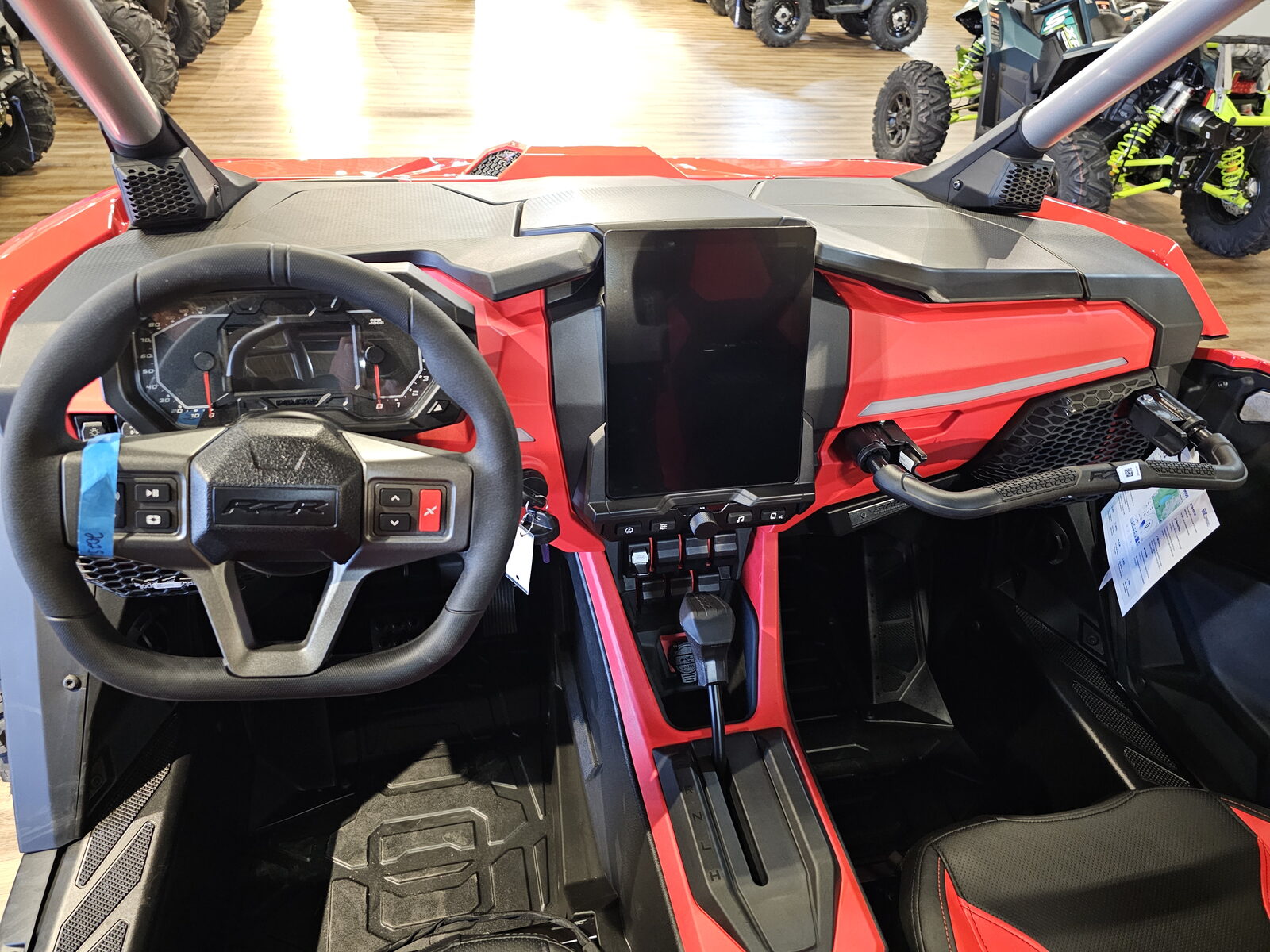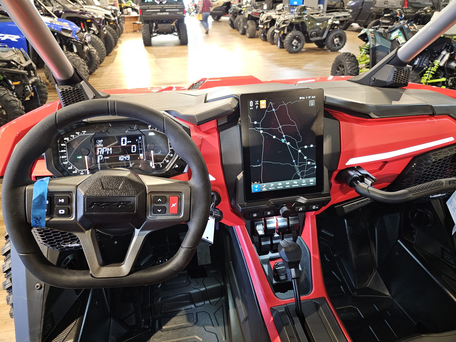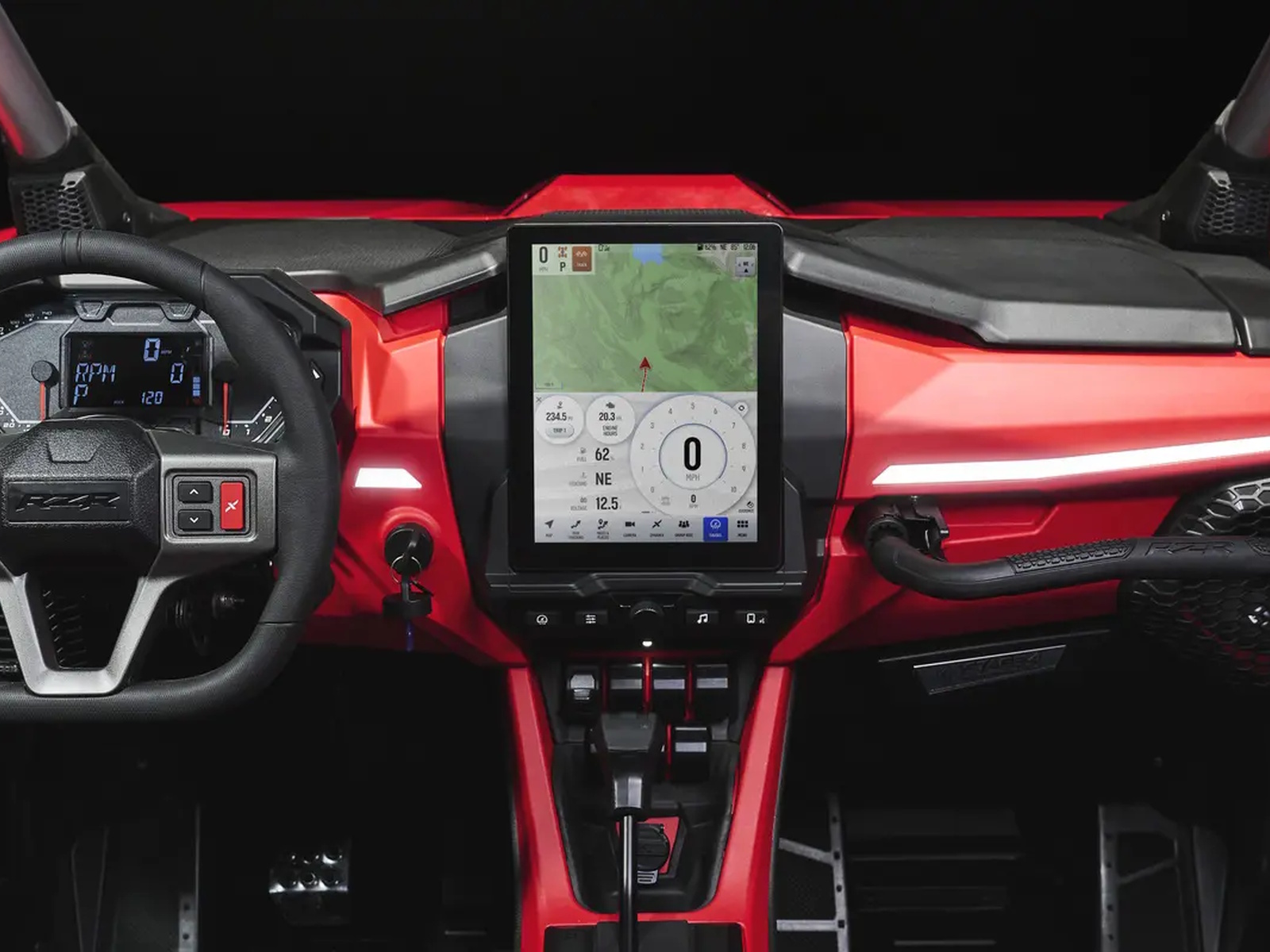Driver: Driver Forward Information Center with 4 in color display + rotary speedometer & tachometers, programmable service intervals, speedometer, tachometer, odometer, tripmeter, clock, hour meter, gear indicator, fuel gauge, coolant temperature, voltmeter, service indicator and codes, seat belt reminder light, gear indicator, DC outlet, Polaris P.A.S.S anti-theft system