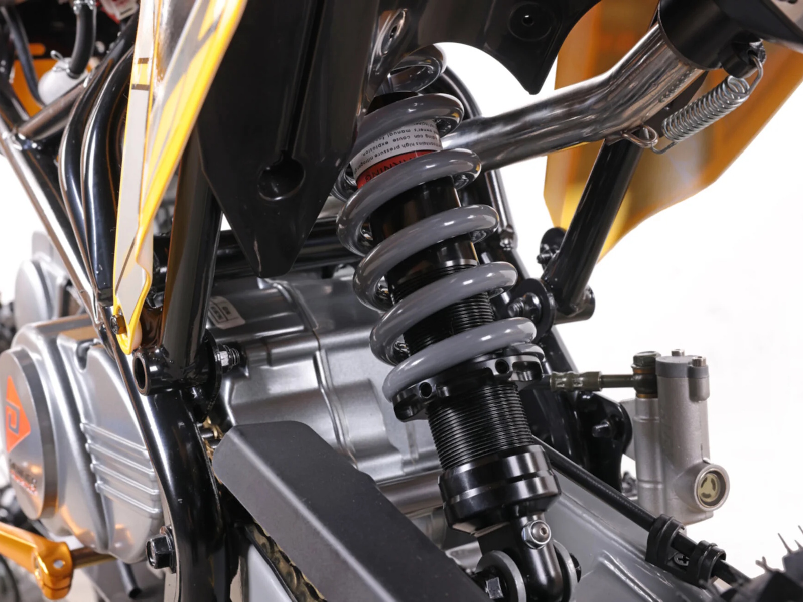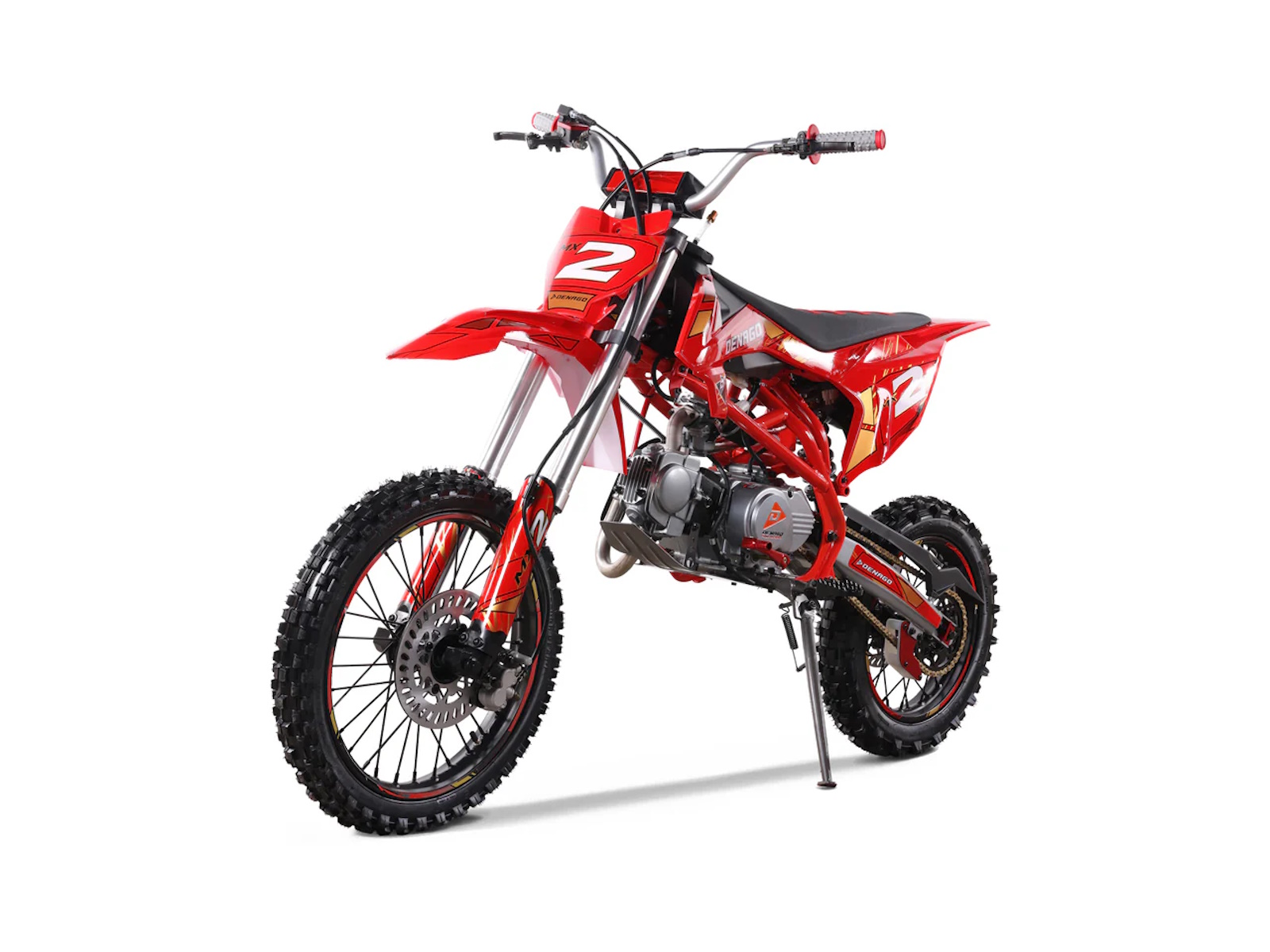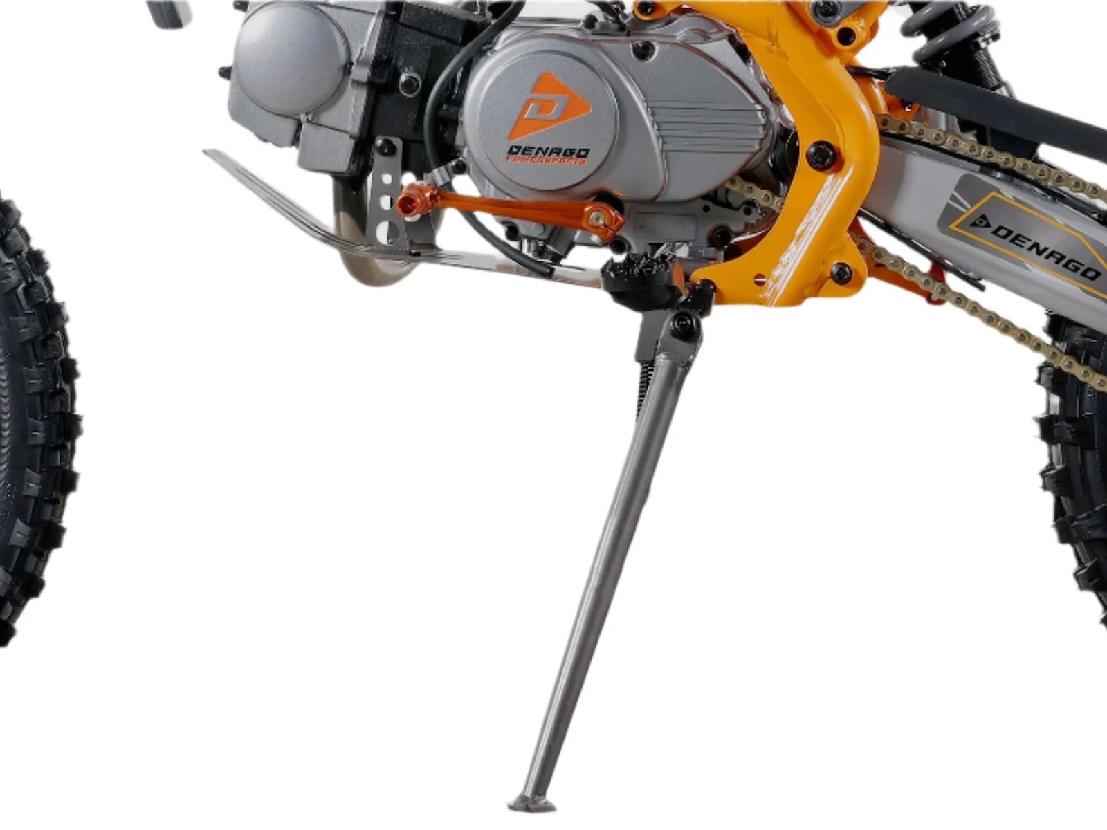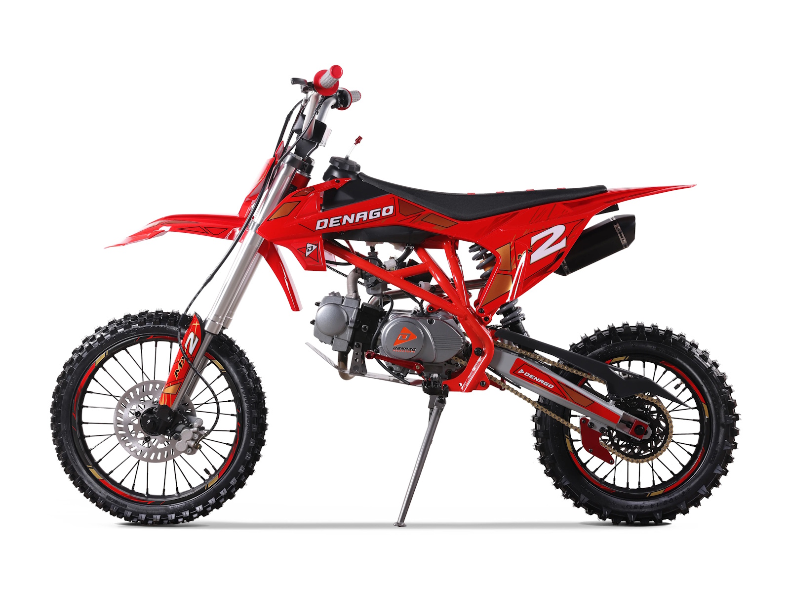 Denago’s MX2 is the ideal choice for teenagers and adults who are looking for a capable yet accessible dirt bike for riding in a variety of terrain. A 125cc overhead-cam engine transmits power through an improved 4-speed transmission and a more durable gold-anodized chain, providing a confidence-inspiring platform for everything from trail riding to the racetrack.