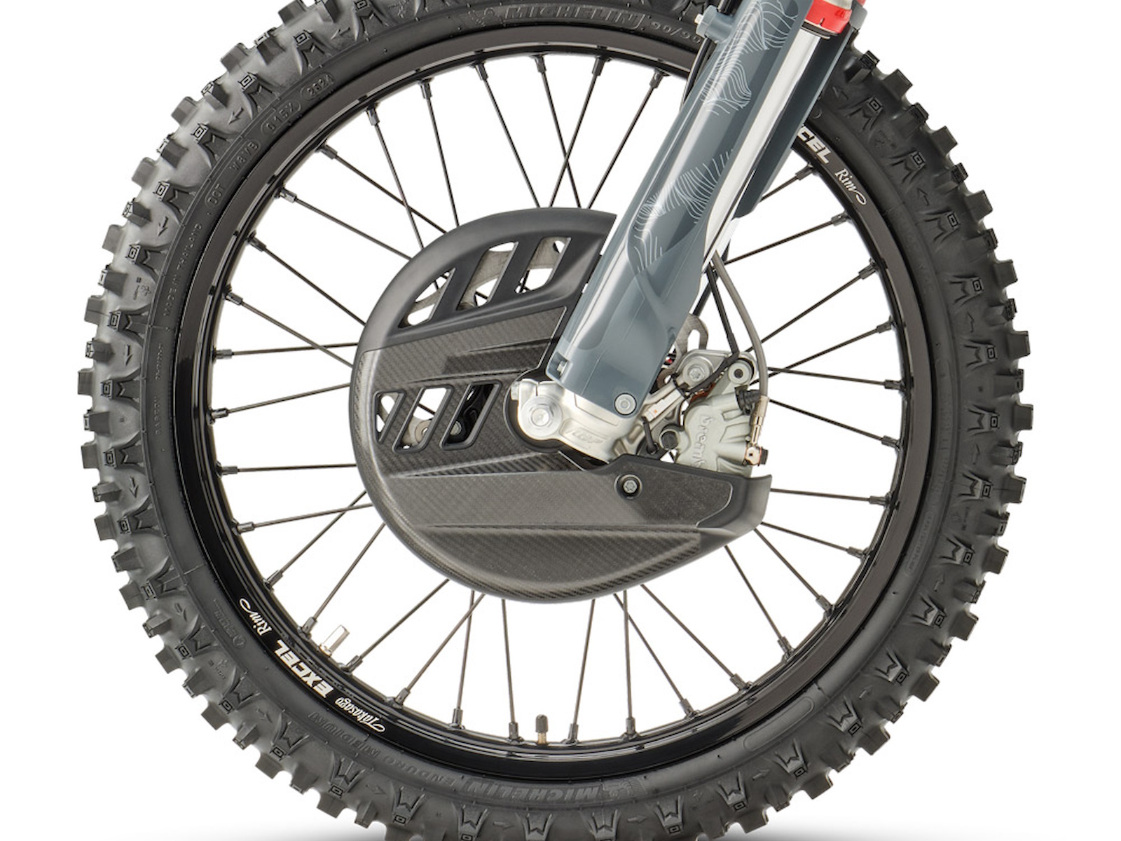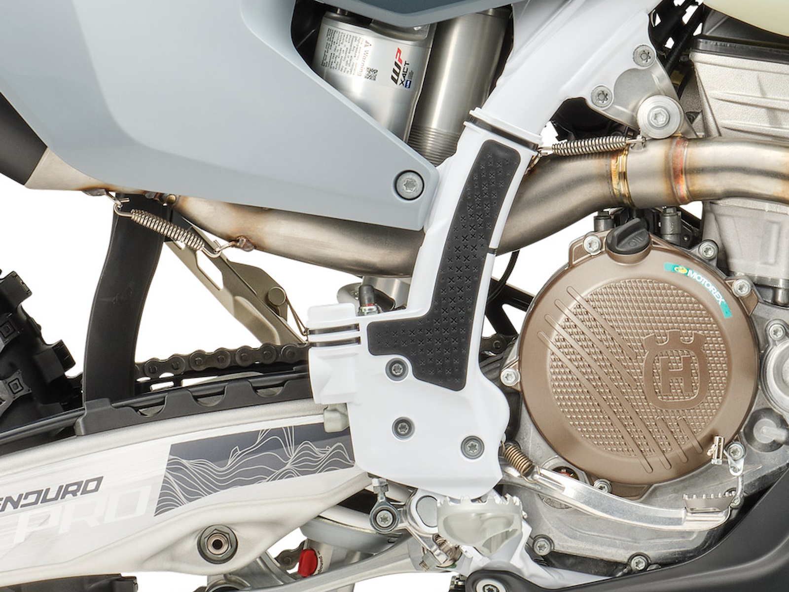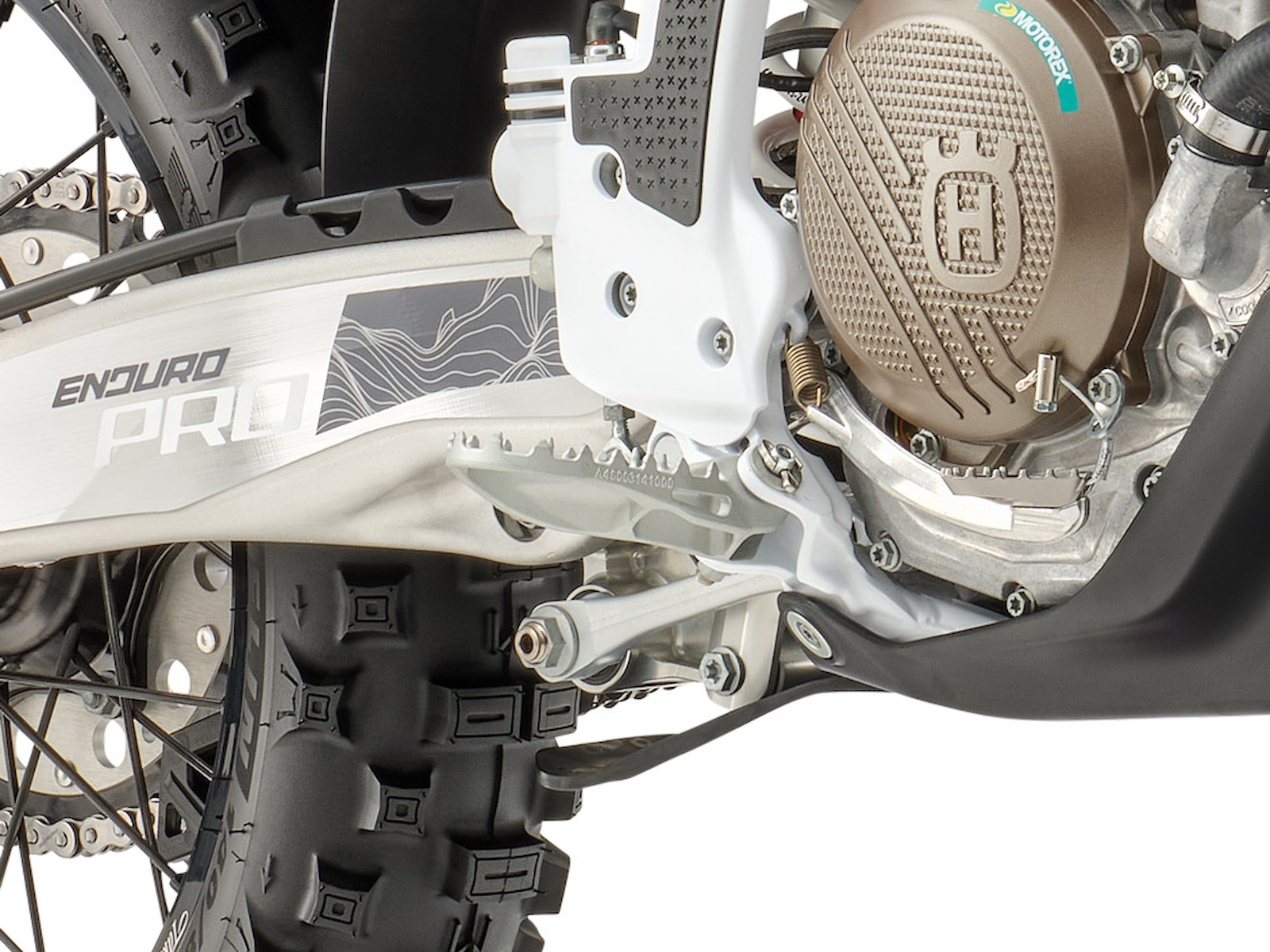 An 8.0 litre fuel tank integrates neatly with the ergonomic bodywork and features a robust rubber cushion beneath it to hold the tank in place and protect the frame from wear. The one-piece fuel pump design and integrated filter allows the tank to be emptied further, which is particularly beneficial during longer events. For durability, the external fuel line is specifically routed to make it less exposed and susceptible to damage. - Footrest