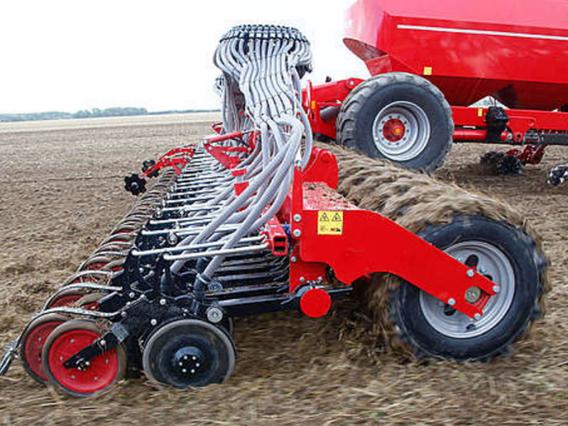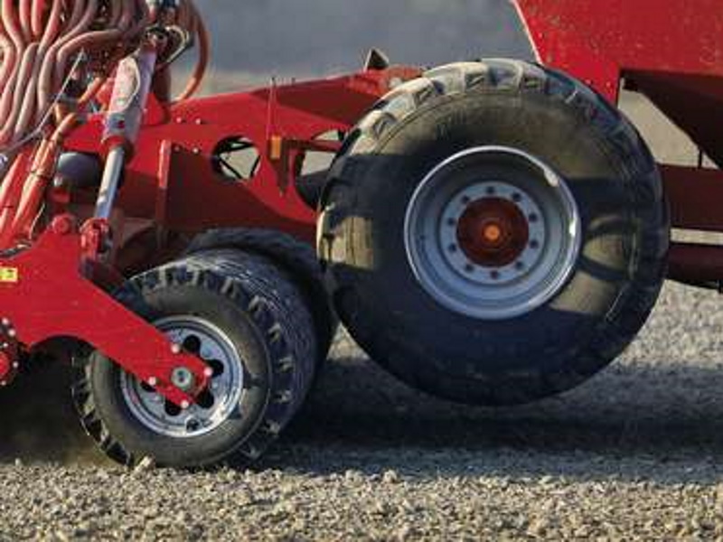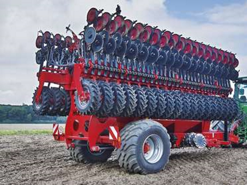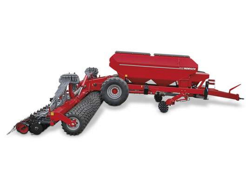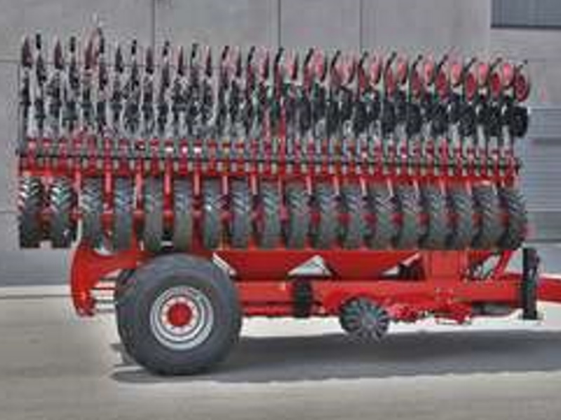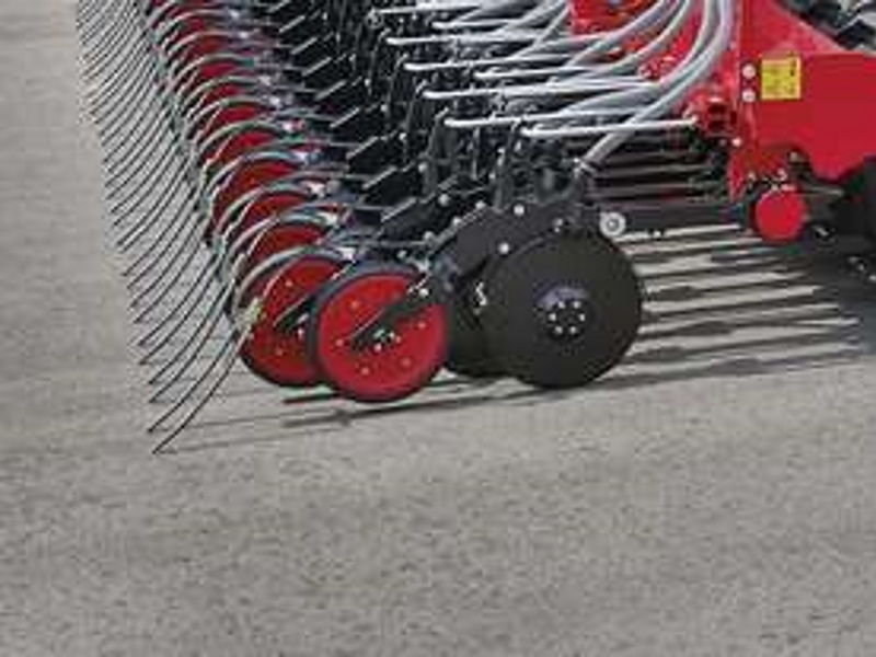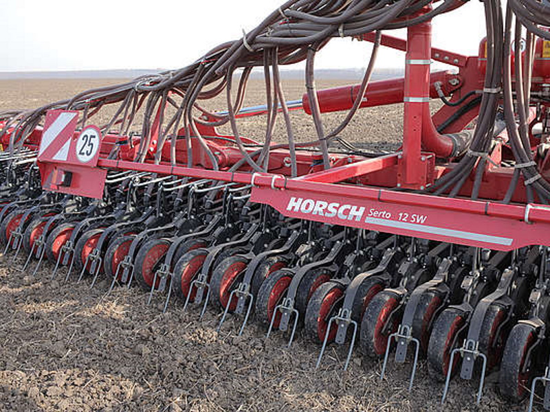 With the Serto SC HORSCH offers a compact seed drill in 10 and 12 m working width without front tools. Its central features are a sophisticated folding technology and an end-to-end tyre packer combined with a heavy double disc coulter. Similar to the well-proven Pronto system two seed coulters with a row spacing of 16.6 cm run behind every tyre. To guarantee a homogeneous depth placement, the Serto is equipped with a packer for levelling and for consolidation.The new HORSCH PowerDisc coulter is ideal for difficult conditions and, even if the seedbed is coarse, guarantees a safe seed placement due to coulter pressures of up to 150 kg per individual row. Due to very large bearings and its design the coulters are extremely solid and long-lasting. We integrated the experiences from the Maestro single grain seed drill in the development. The hopper capacity of the Serto amounts to a total of 6 000 liter, partition ratio 60 : 40. Thus, either 6 000 liter of seed can be applied or a combination of seed and fertiliser with a hopper partition of 3 600 liter in the front and 2 400 liter in the rear hopper. A 300 liter hopper for a micro-granular compound as a third component is available as an option. For an efficient loosening of the tractor tracks track eradicator tines or wavy-disc track eradicators are available. The wavy discs that are arranged in pairs are ideal especially on heavy soils, as no rough clods are broken from the seedbed and the tolerance for harvest residues is particularly high. At the push of a button the machine folds to a transport width of 3 m.