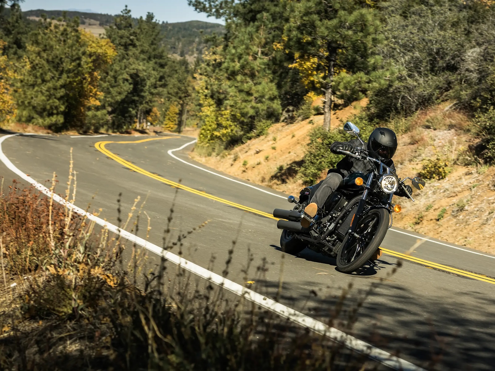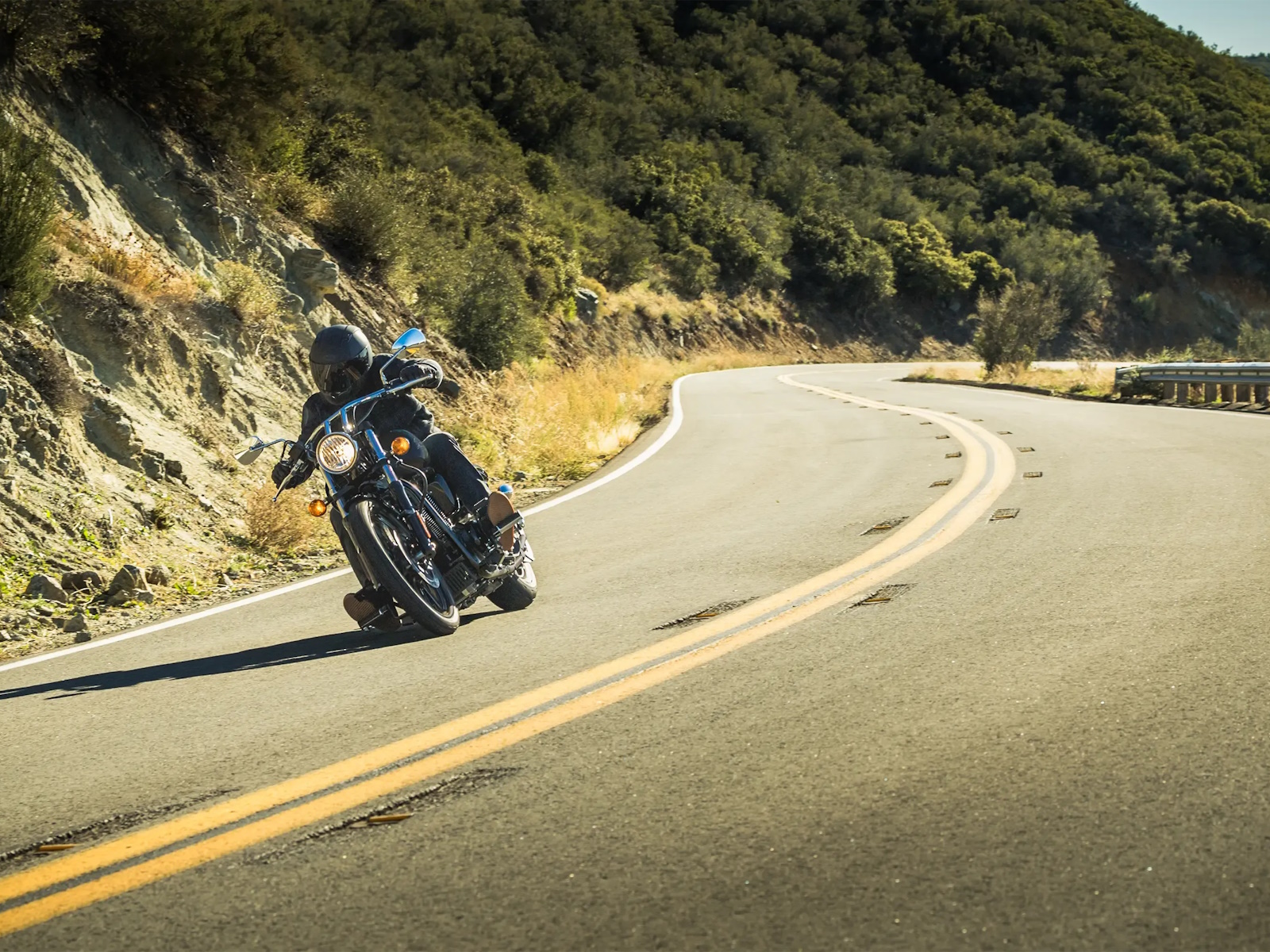 - Wide drag bars and forward-mounted footpegs
