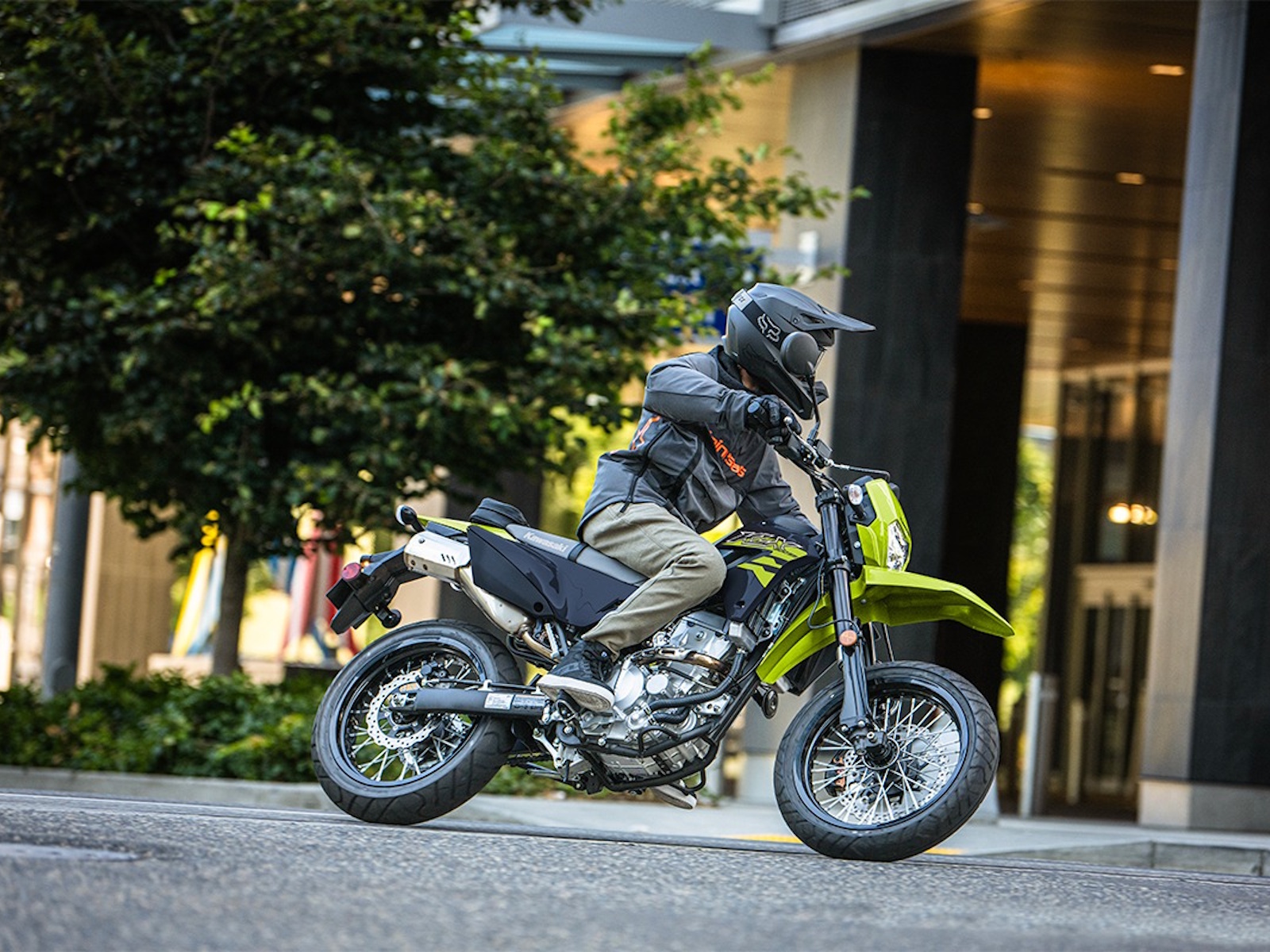 The class-leading KLX®300SM lightweight motorcycle takes the fun to the streets in full supermoto style. A quick-accelerating engine, paired with light, agile handling helps riders of all skill levels maneuver through city traffic, navigate country backroads, or experience the exhilaration of supermoto racing at a track. Suspension, wheels, and brakes have been tuned for supermoto-style performance.