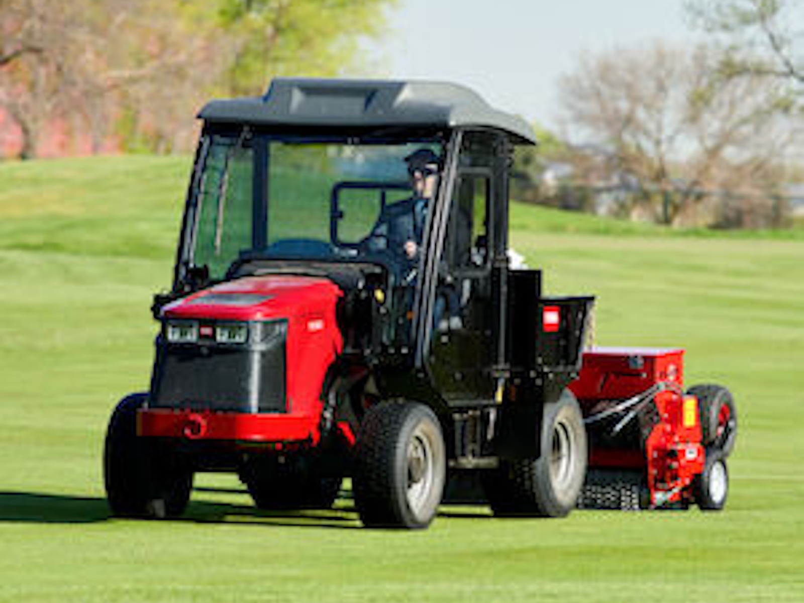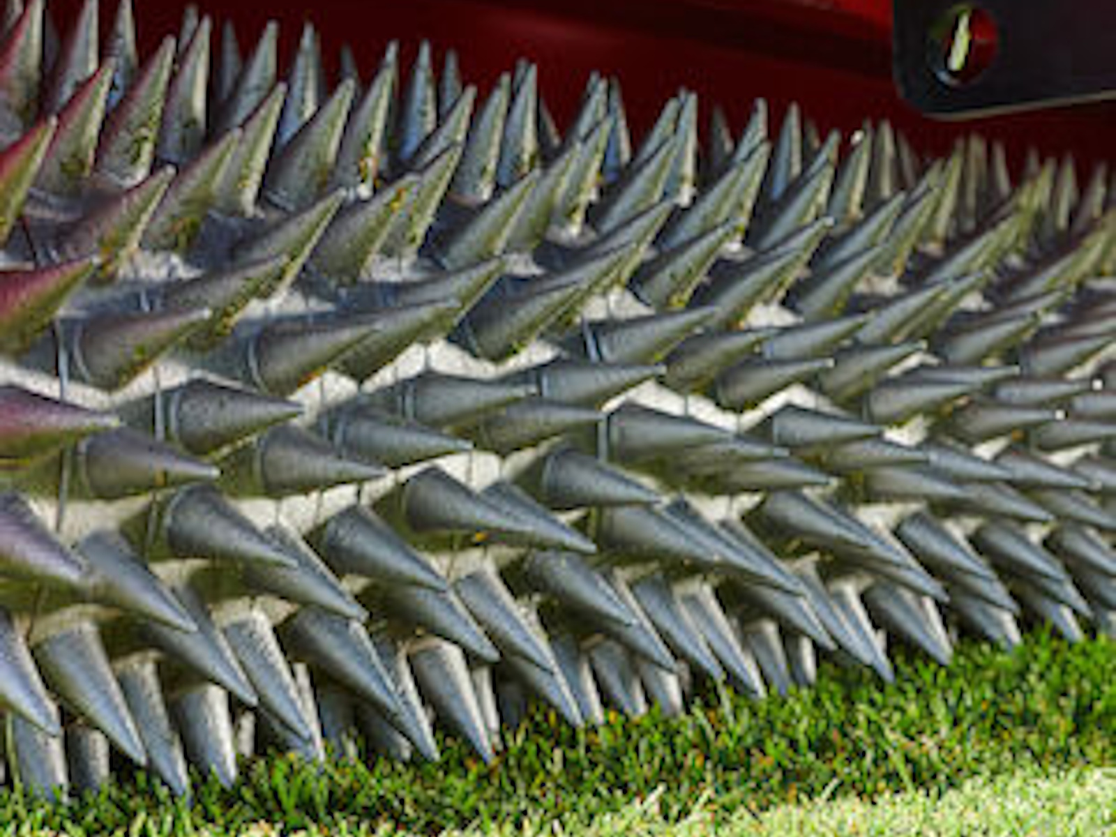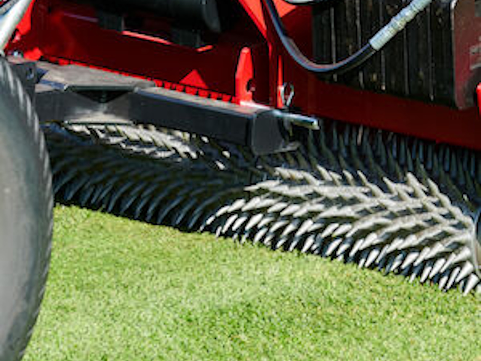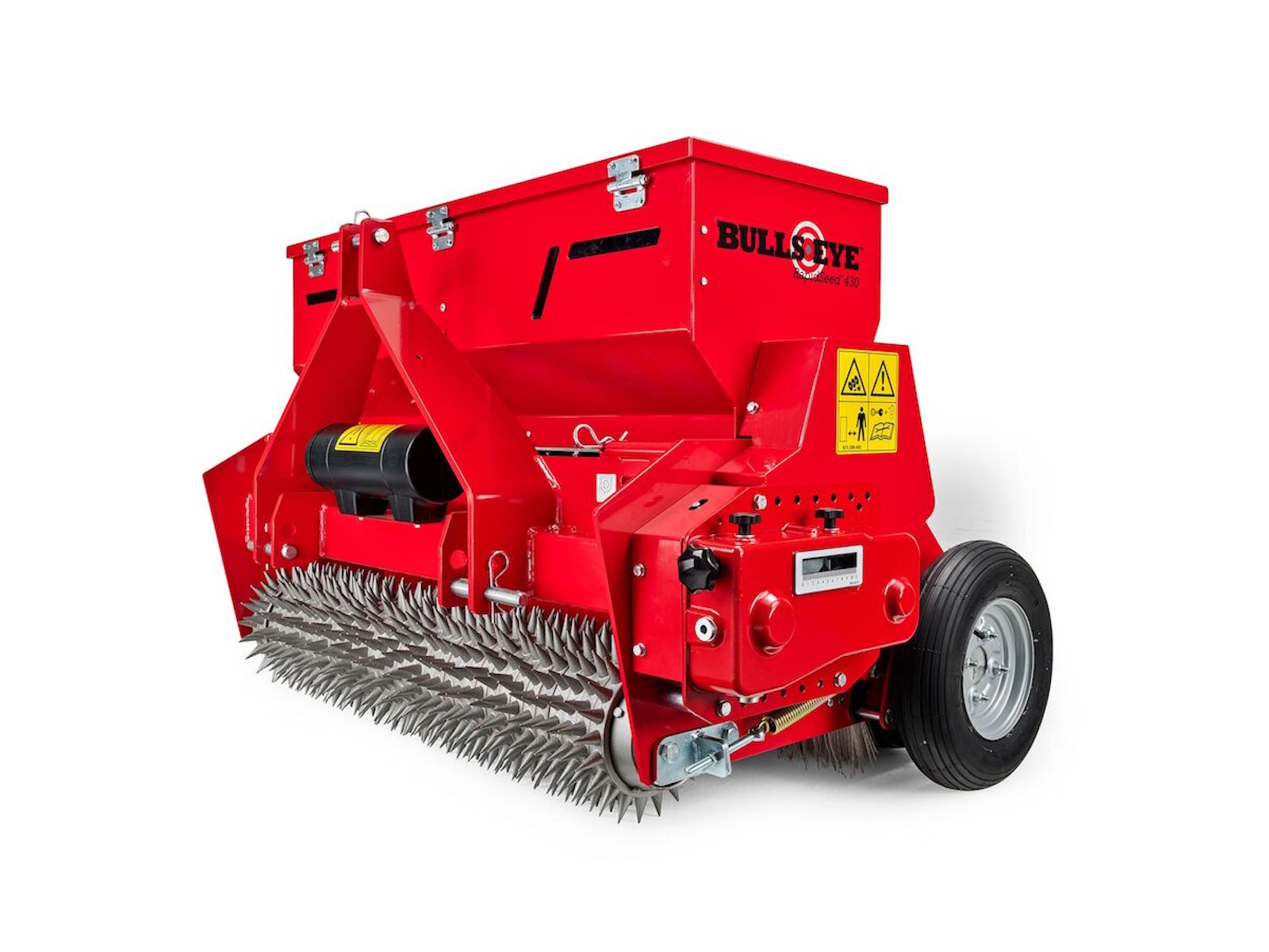 The Bullseye RapidSeed™ 430 is ideal for sports fields and golf courses where economy and random seed dispersement is important. The RapidSeed™ 430 offers the same accurate means to produce thousands of holes, deliver the seed and brush in, all with a single machine with a width suitable for tighter, more undulating areas. The spikes are conical-shaped, so more seed actually drops into the holes. The seeds drop when the side wheel turns, so there is no spillage of seed when the machine is not in operation. An optional replacement rear spiked roller can be added to double the number of holes per pass. The optional hydraulic lift wheel kit allows the seeder to be towed behind even a Workman® HDX and provides improved ground-following ability.