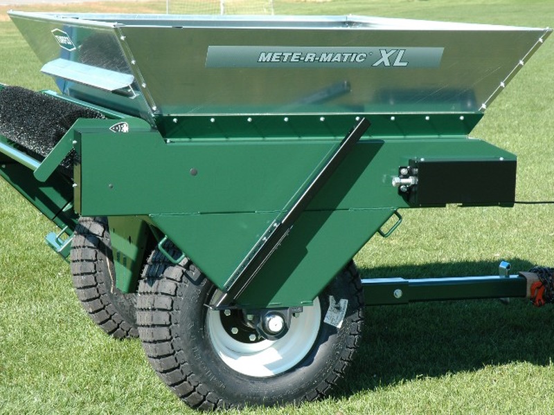 At 2.25 cubic yards, the Mete-R-Matic XL is ideal for large turf areas, requiring less reloading and increasing transportation efficiency. The larger capacity hopper can easily be filled with a Turfco CR-15  or other front-end loader. Made of galvanized steel, the self-cleaning hopper won't rust or flake.
